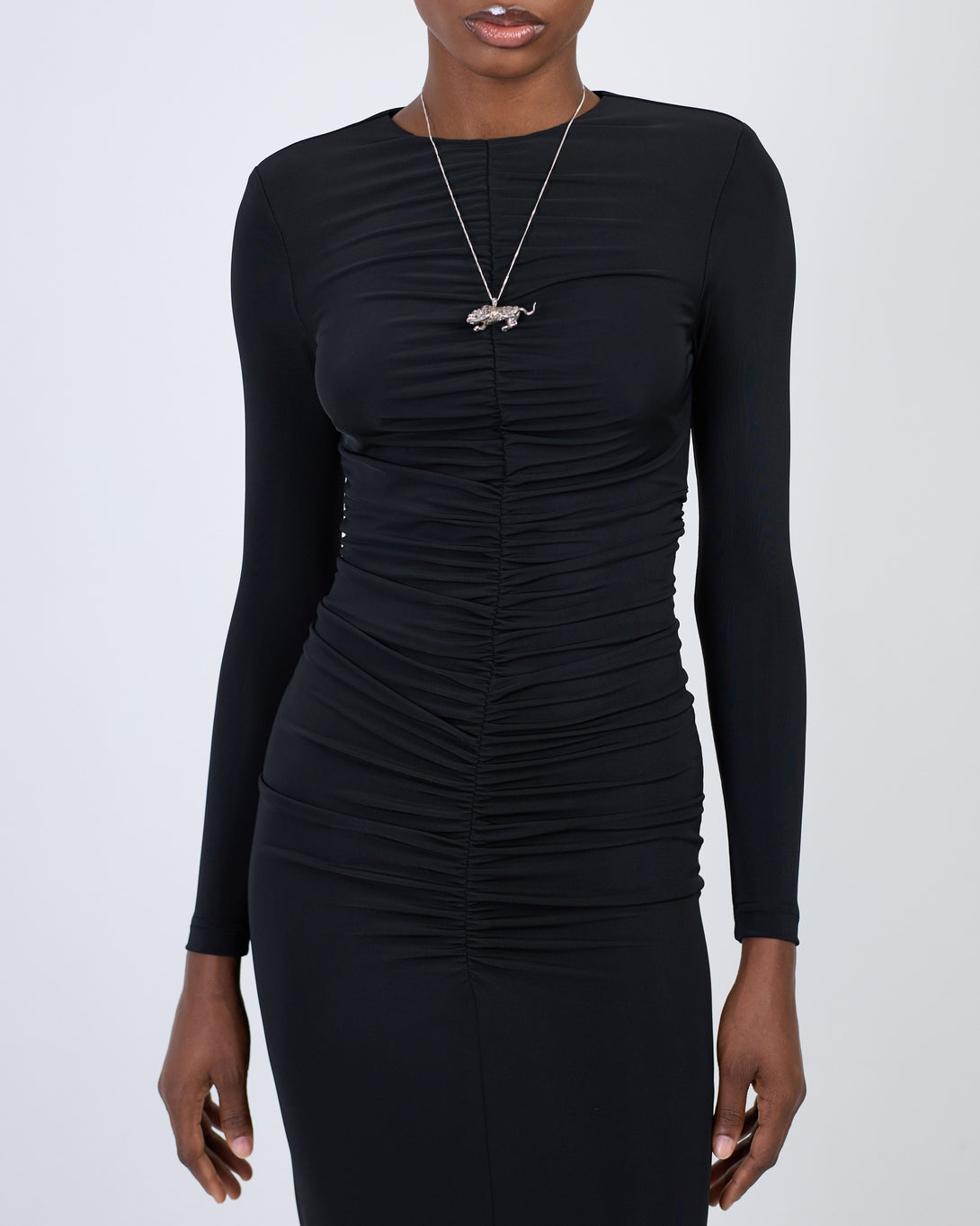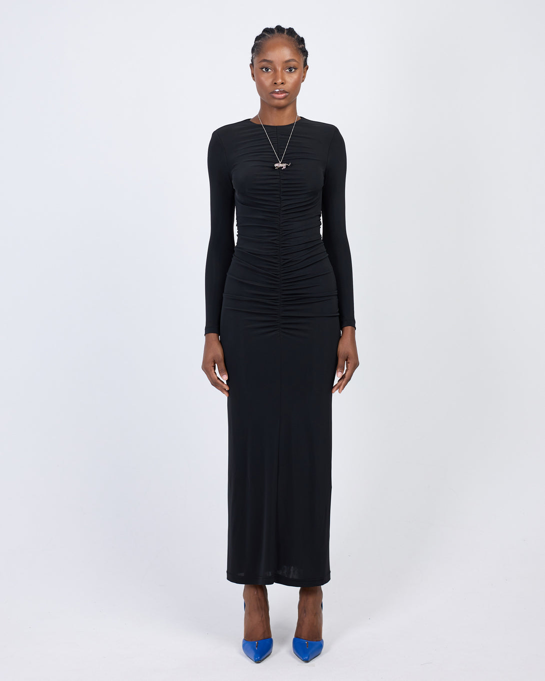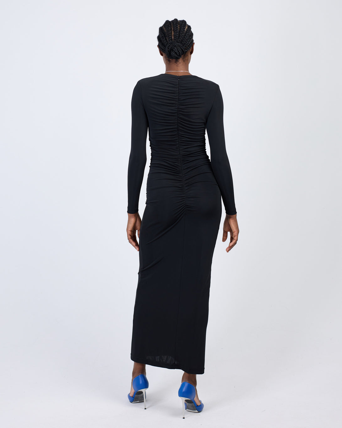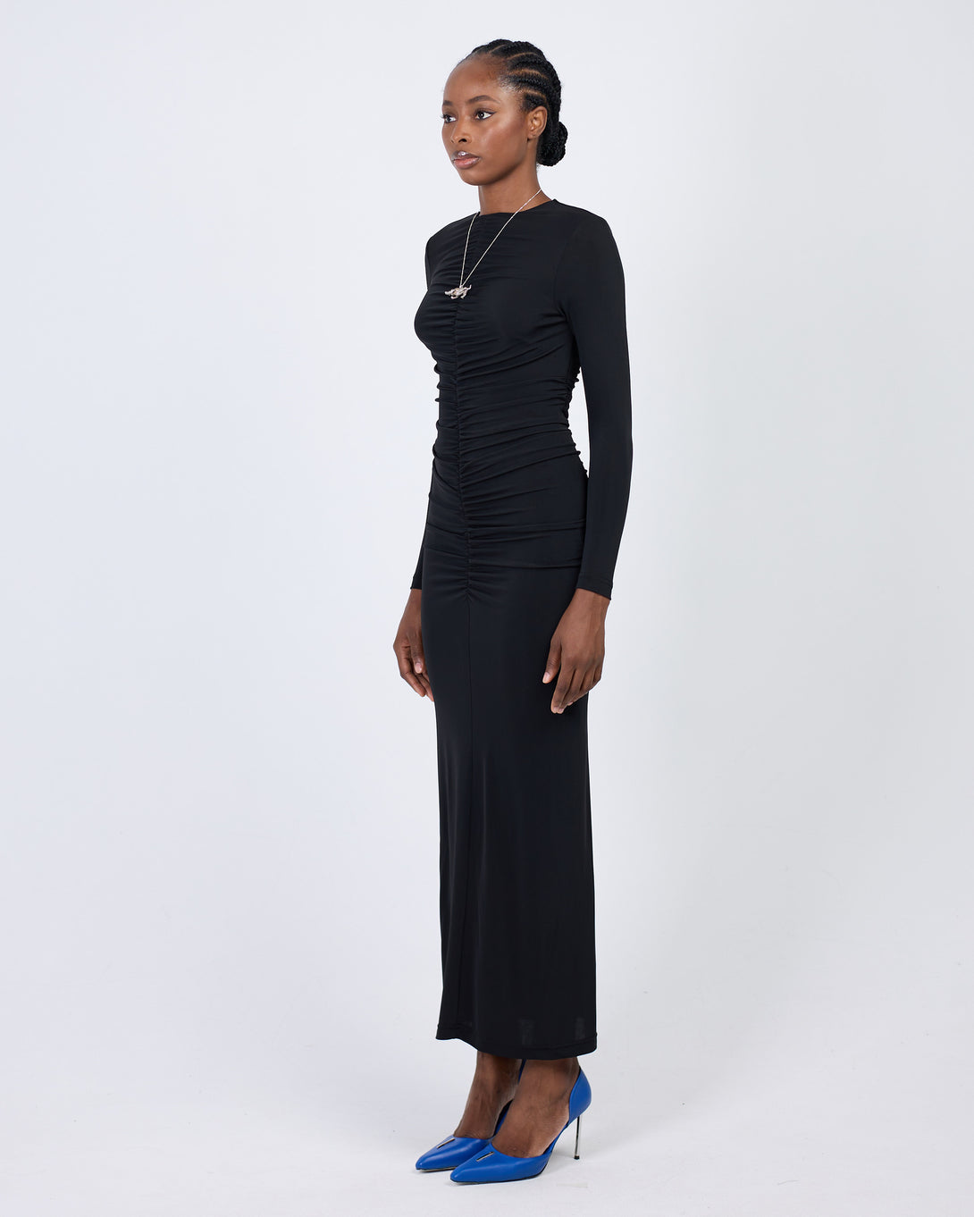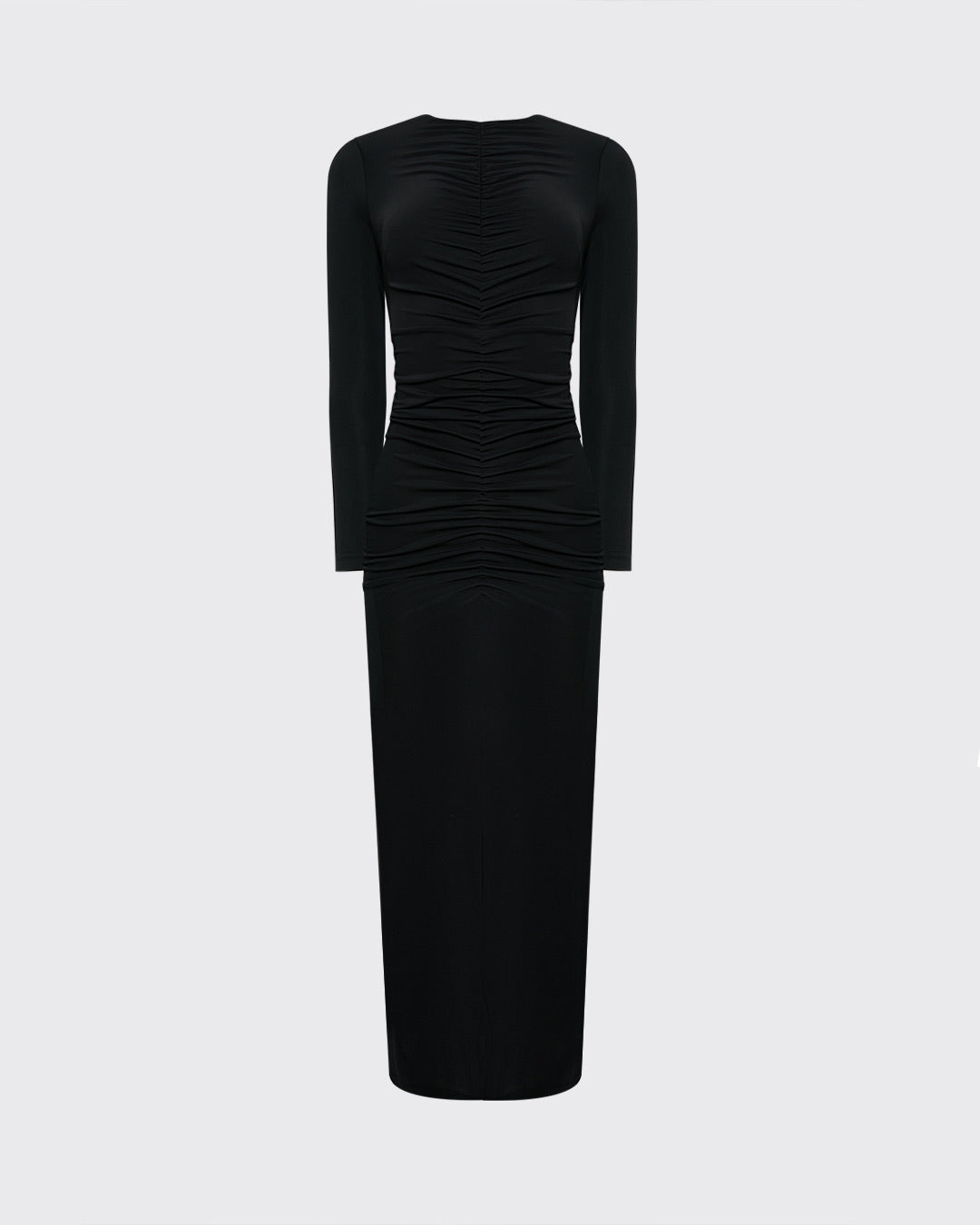 Expertly designed to enhance your silhouette, our PLEATED BLACK DRESS is a must-have for any woman's wardrobe. With front and back gathers along the center seam, this fitted maxi dress adds a touch of sophistication to your look. Elevate your style with this timeless statement piece.