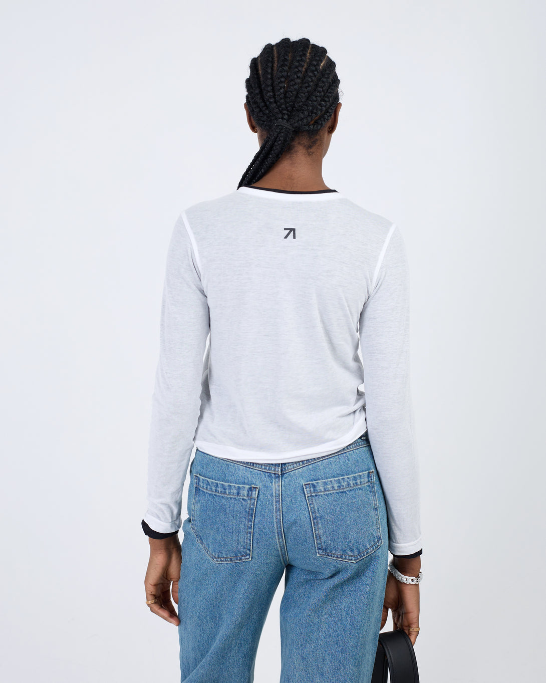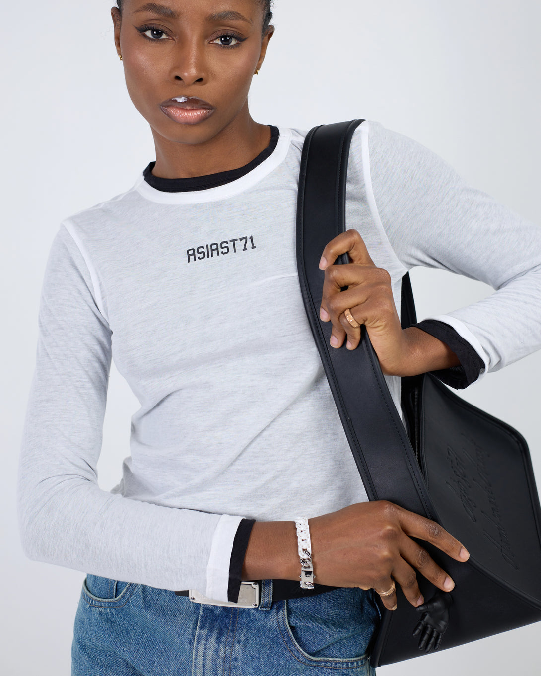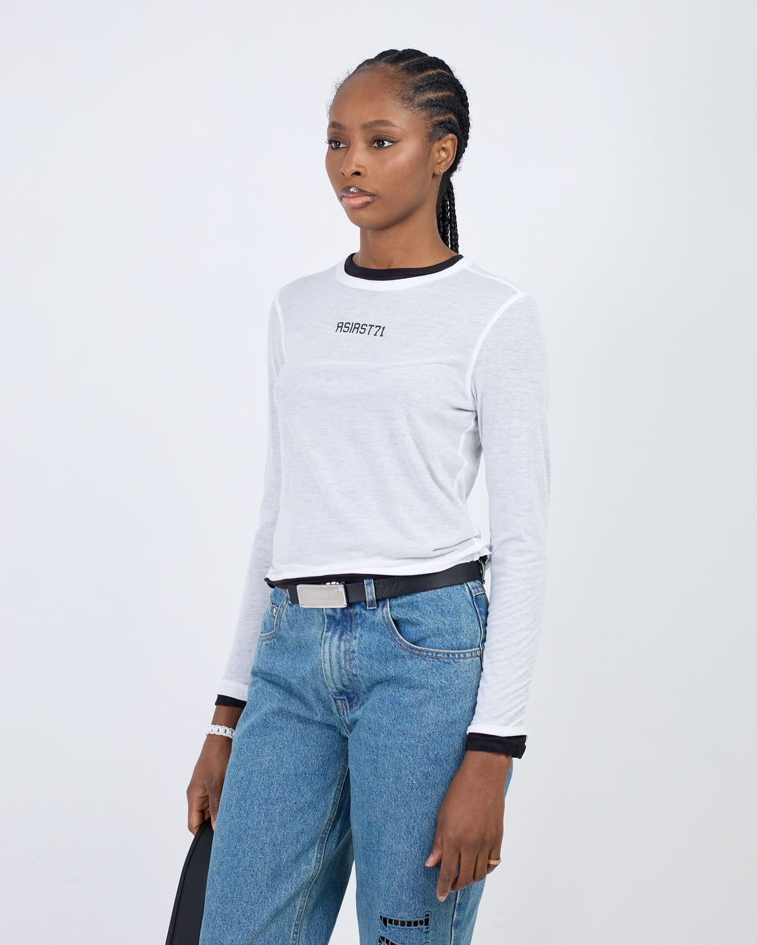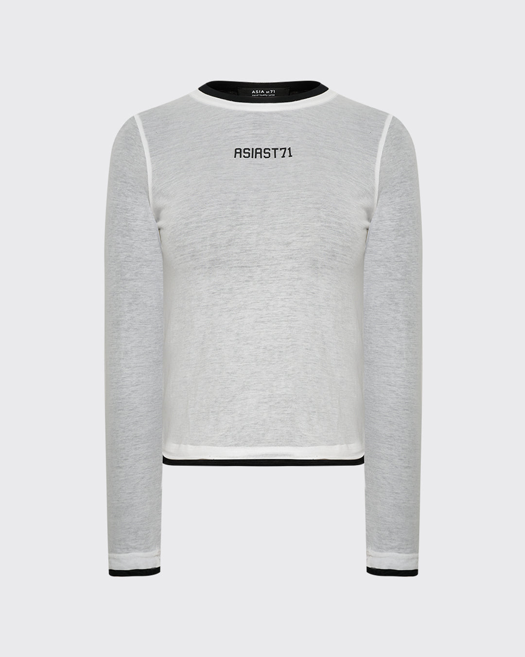 Expertly designed, this LONGSLEEVE DOUBLE LAYER WHITE features a lightweight and semi-transparent cotton. Its contrasting logos - the iconic arrow on the back and Asia st 71 logo on the front - add a touch of style to this basic yet trendy piece. Perfect for layering or wearing on its own.