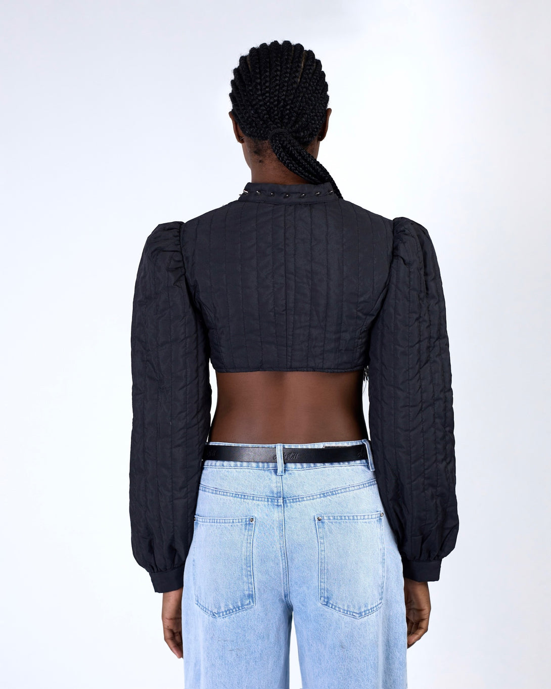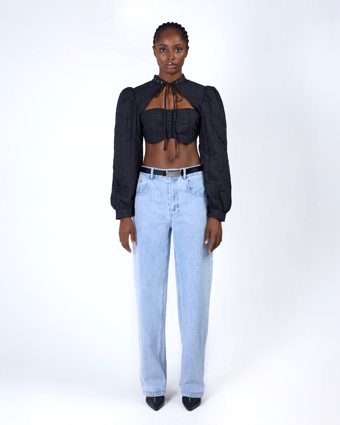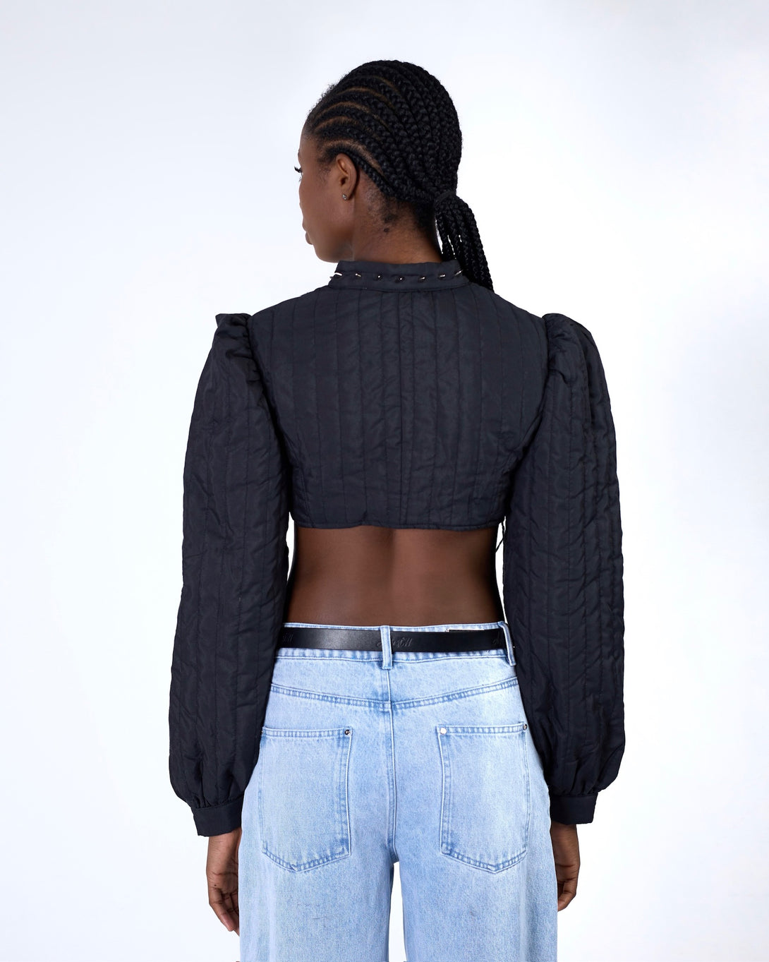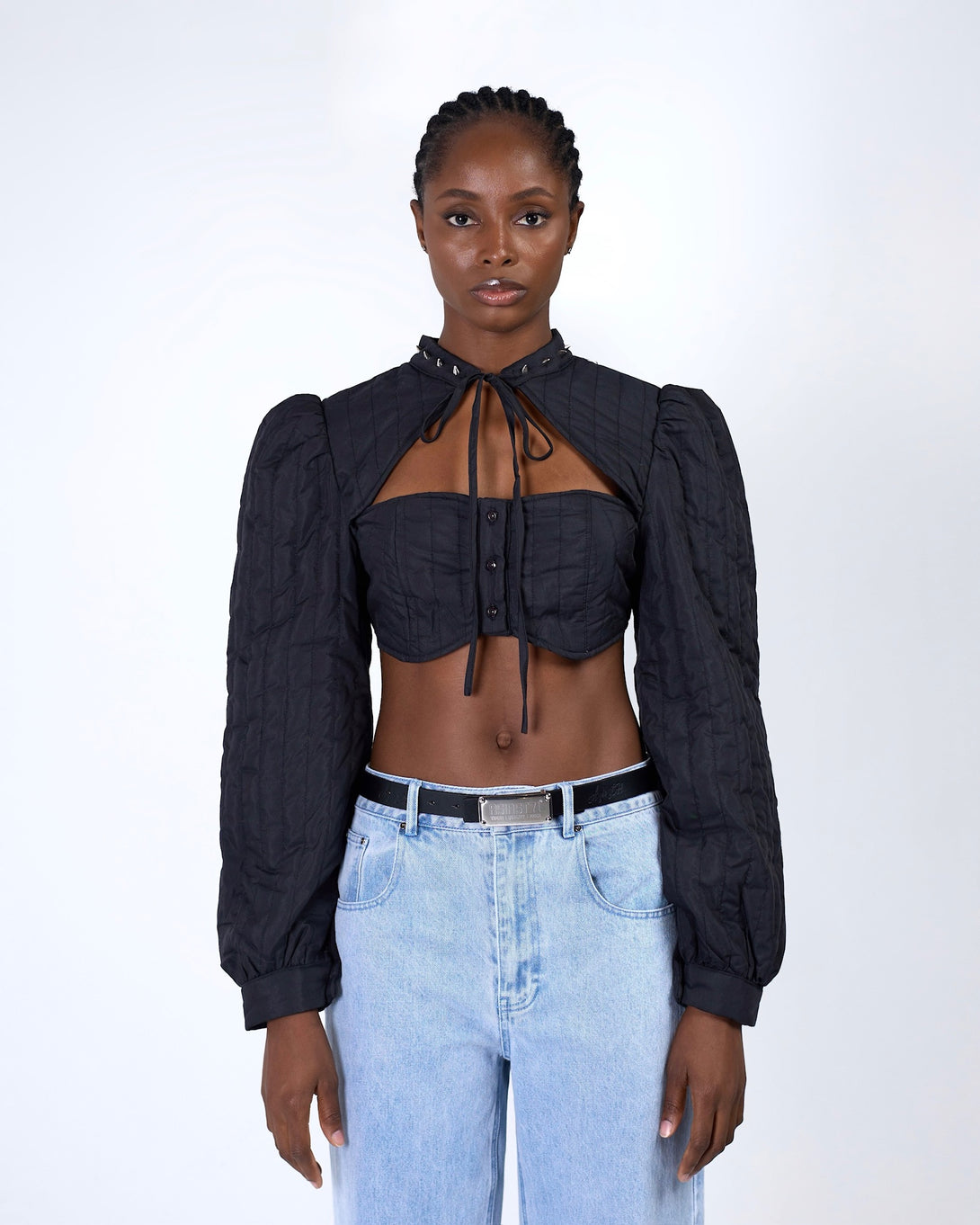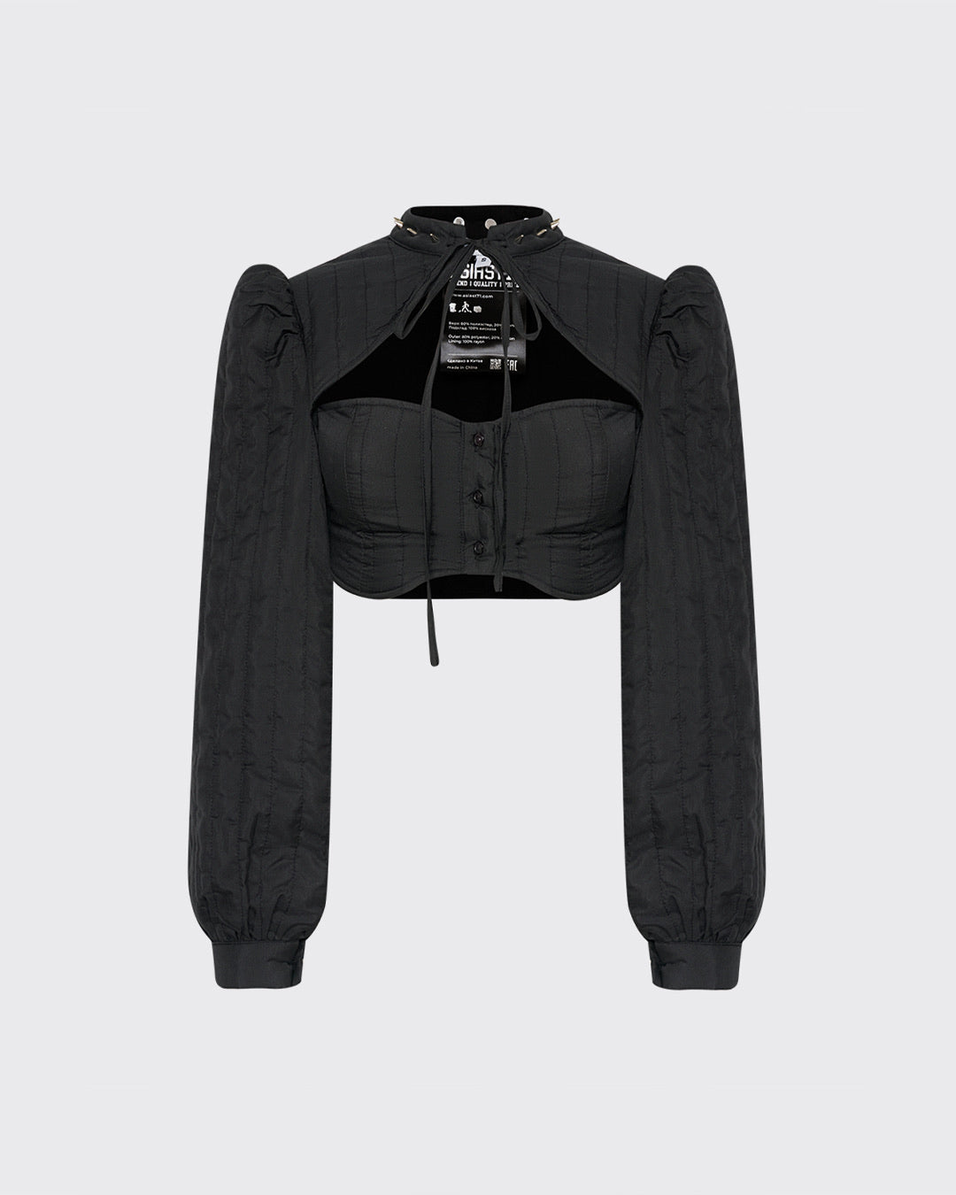 Expertly crafted from structured fabric, TOP CASTLE WHITE shapes and flatters with a built-in corset and lantern sleeves. A versatile neckline and adjustable tie at the neck personalize the fit. Elevate your style with the edgy spike detail.