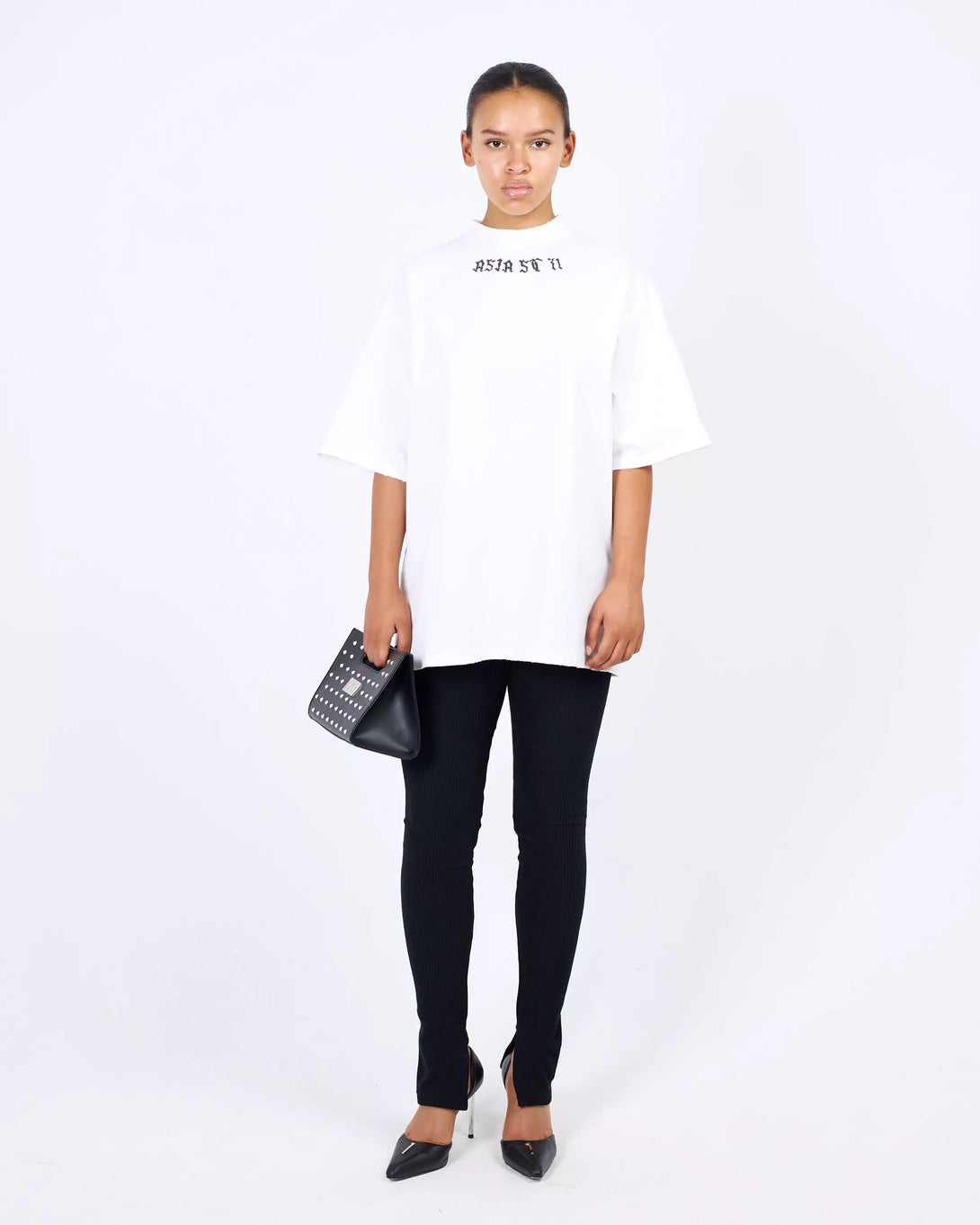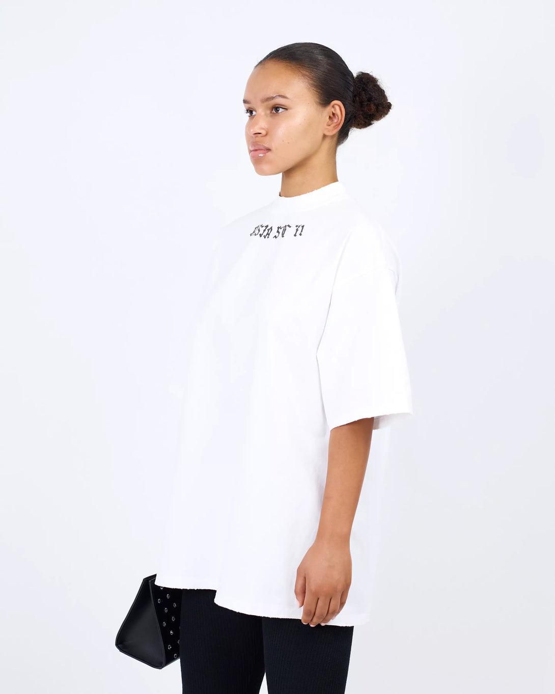 Expertly crafted from high-quality cotton, this T-SHIRT GOTIC ARROW WHITE is designed for style and comfort. The loose fit and dropped shoulder provide a modern, relaxed look, while the contrast minimalist print adds a touch of timeless elegance. With a density of 320 GR, this shirt is durable and will maintain its shape wear after wear.
