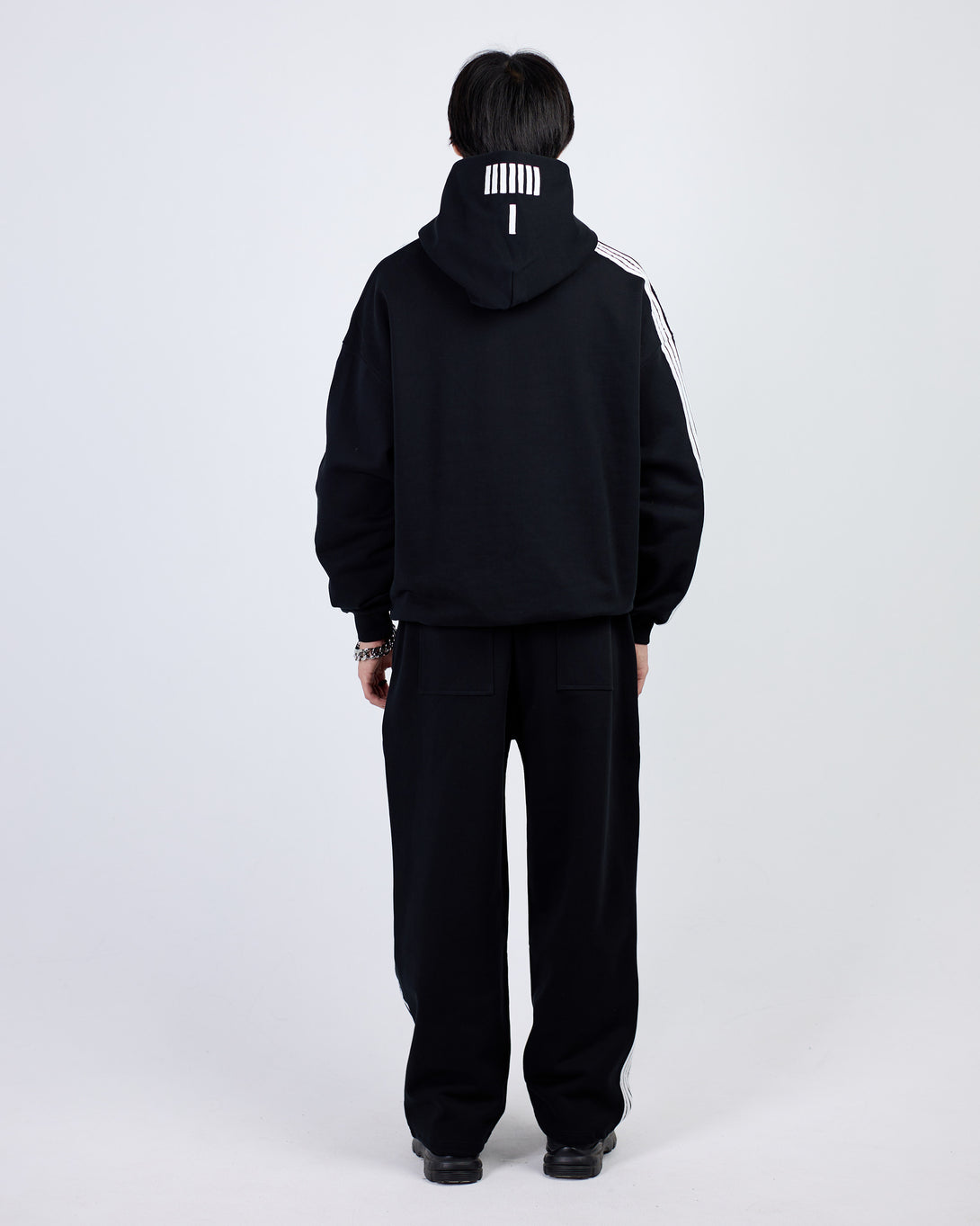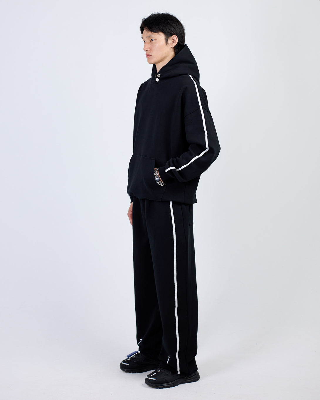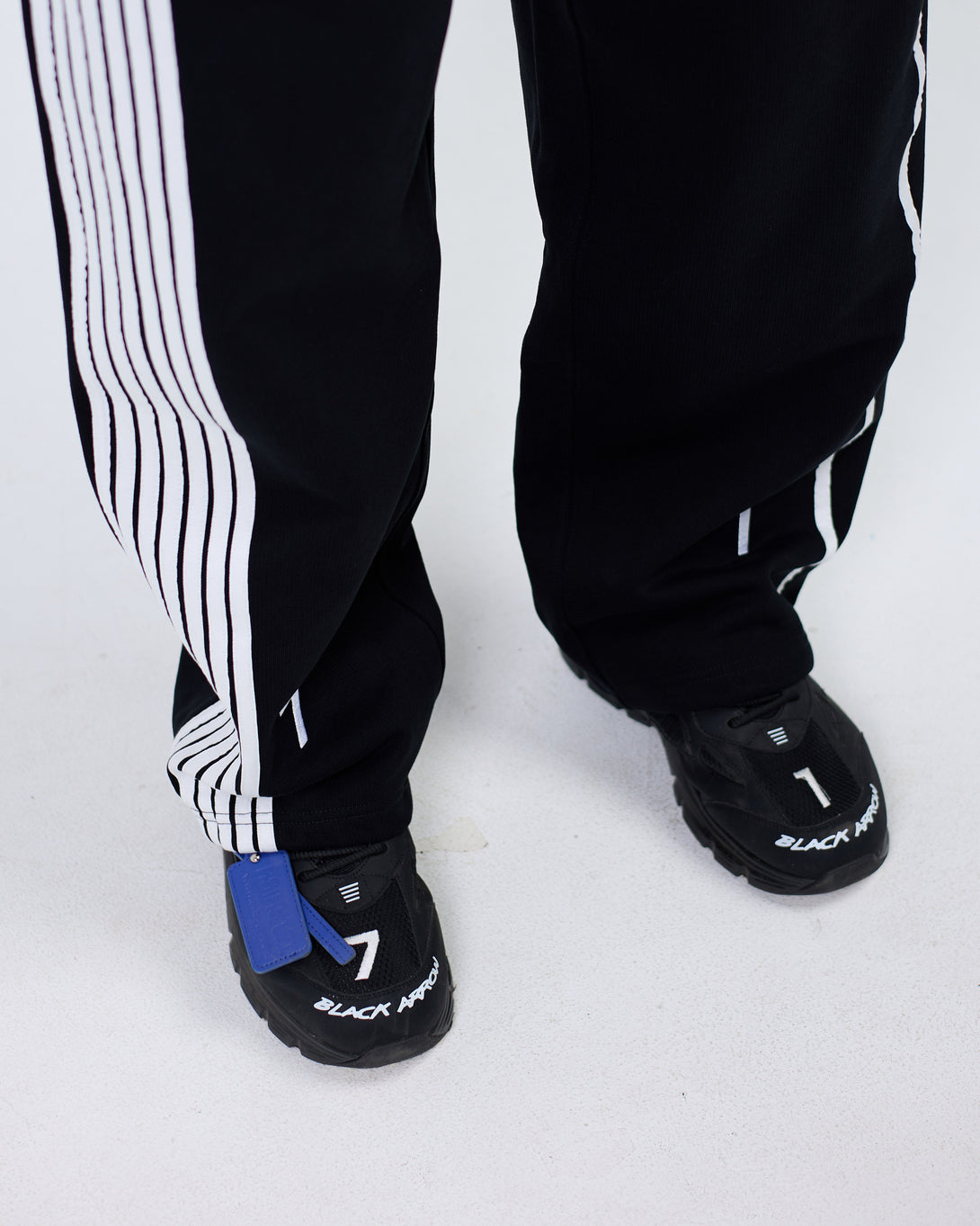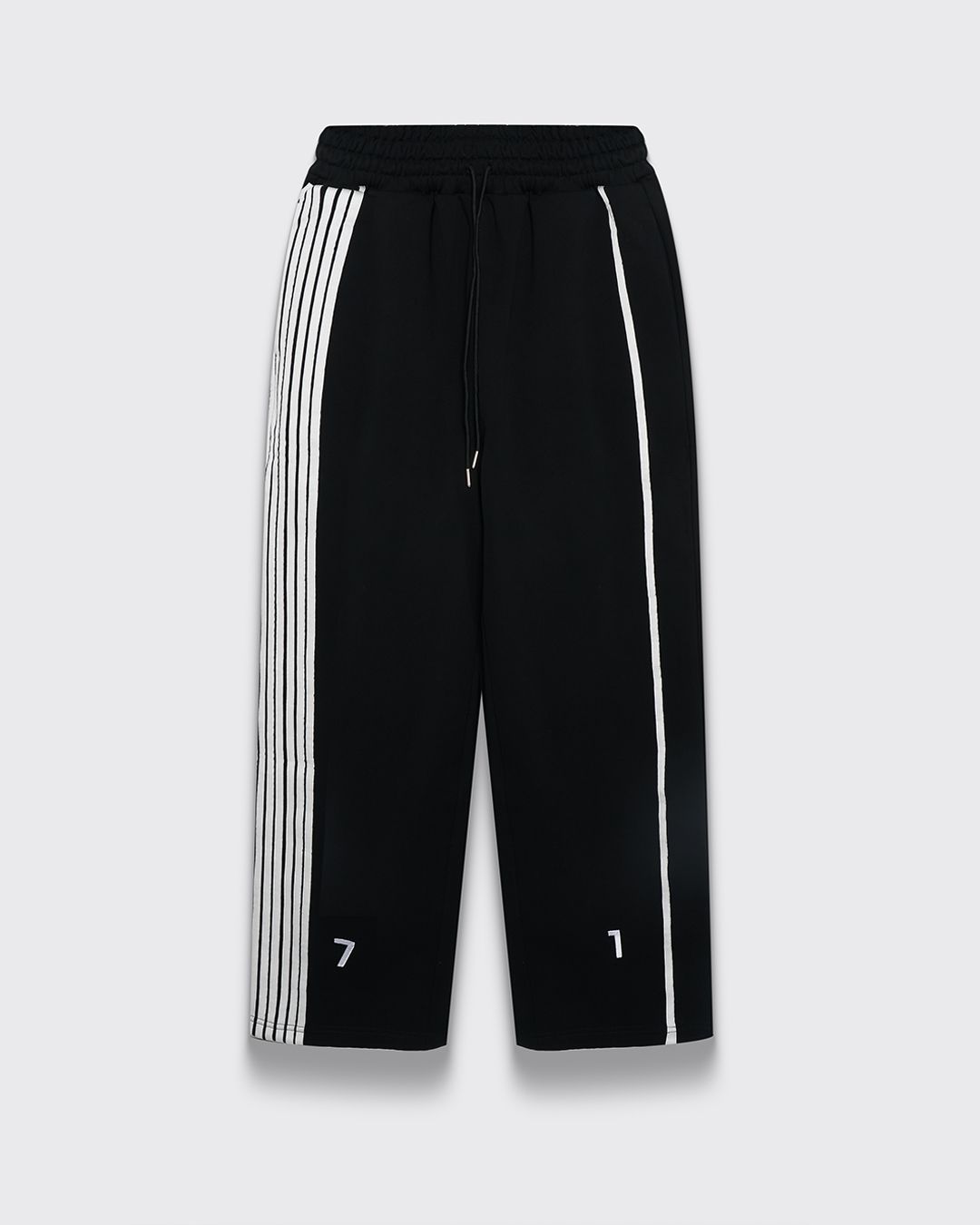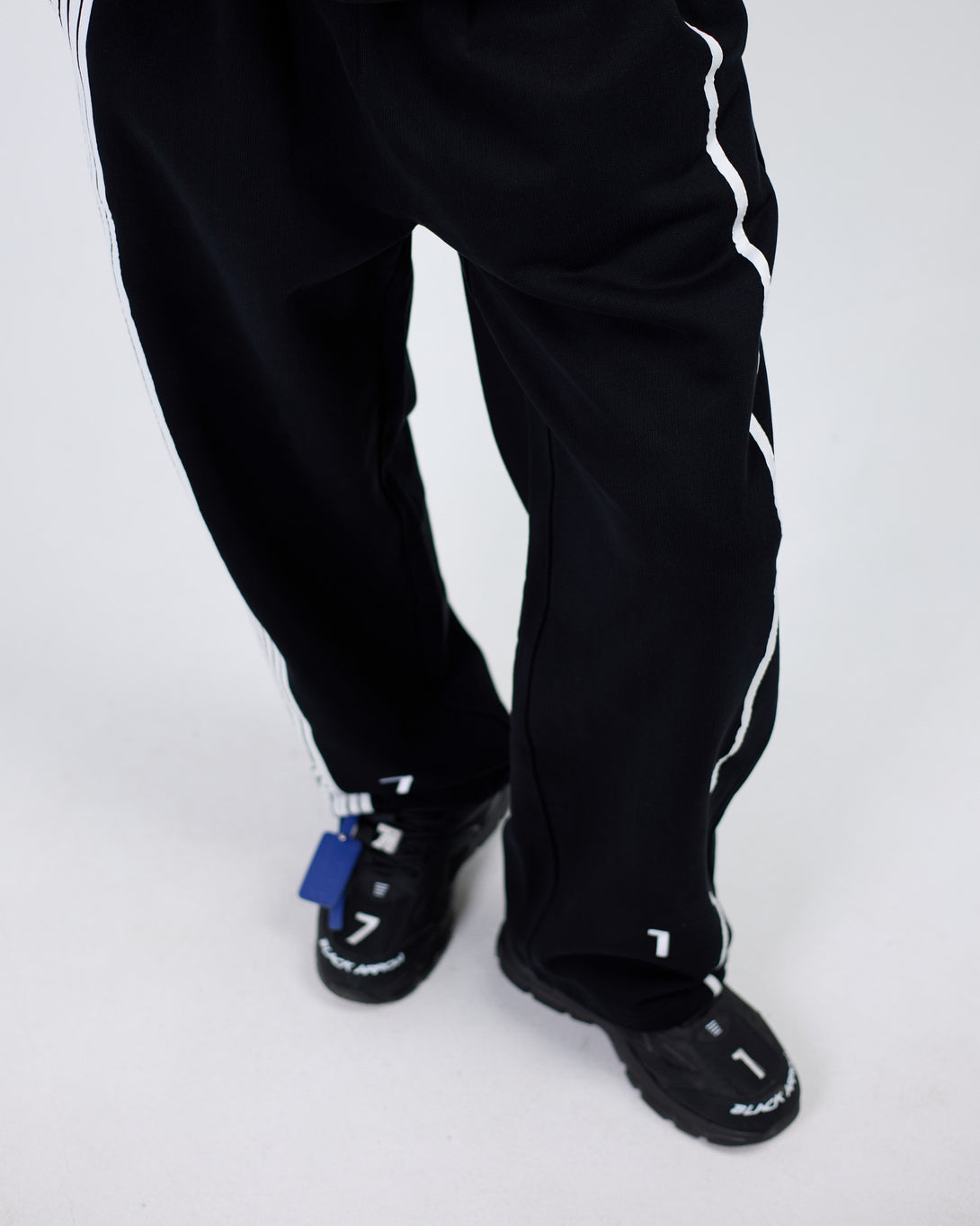 Ce pantalon de jogging rayé noir 580 g est confectionné en coton épais 580 g. Il offre une coupe confortable et présente une coupe large avec des rayures latérales. Sa taille élastique ajoute au confort. Il est idéal avec un sweat à capuche ou un t-shirt, et s'associe parfaitement avec des accessoires pour une touche de style.