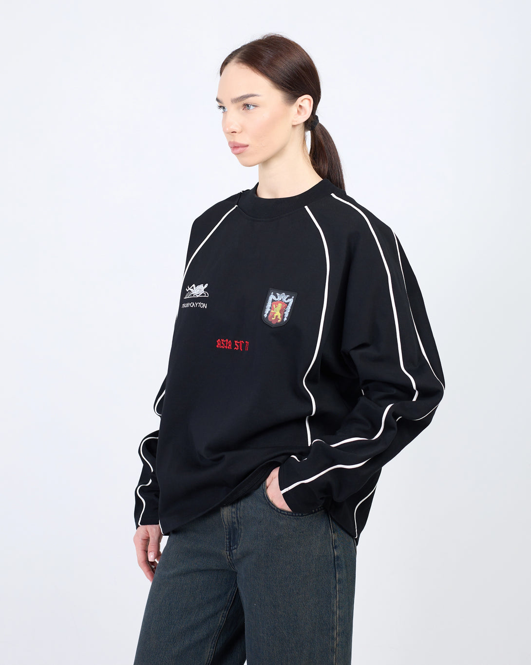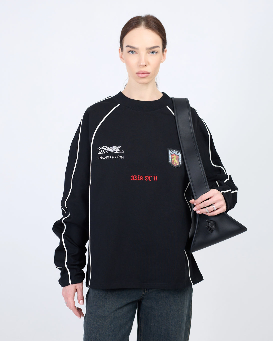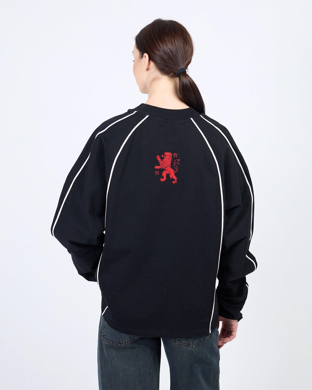 Ce t-shirt noir à manches longues avec blason lion est confectionné en coton épais et présente une manche oversize pour une coupe ample et confortable. La broderie 3D ajoute de la profondeur à l'imprimé. Idéal au quotidien comme pour des tenues audacieuses.