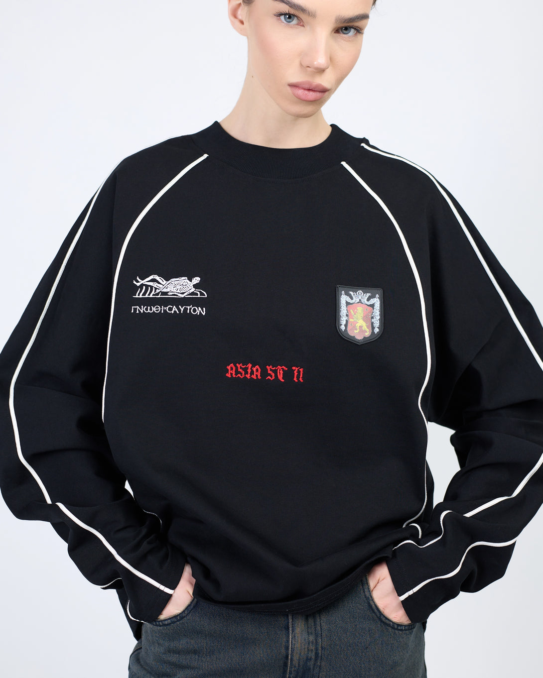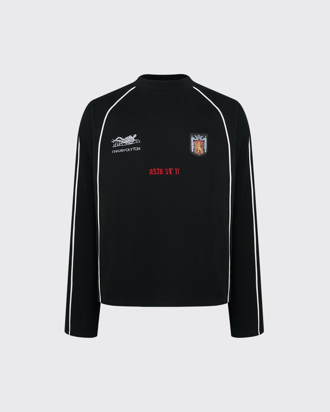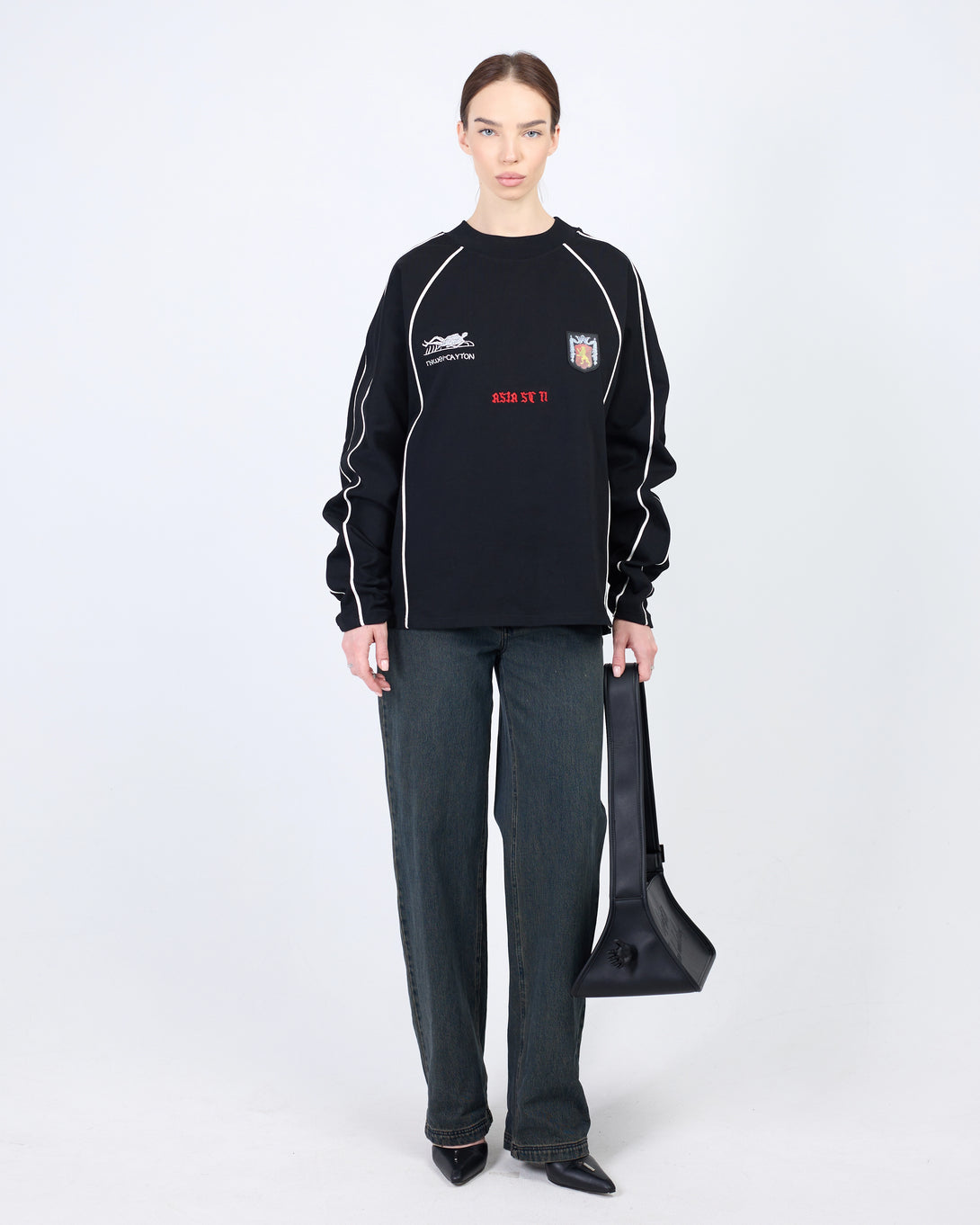 Ce t-shirt noir à manches longues avec blason lion est confectionné en coton épais et présente une manche oversize pour une coupe ample et confortable. La broderie 3D ajoute de la profondeur à l'imprimé. Idéal au quotidien comme pour des tenues audacieuses.