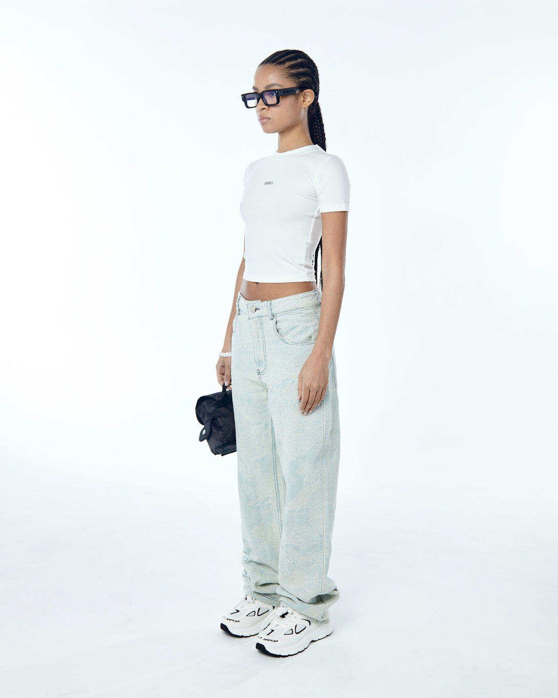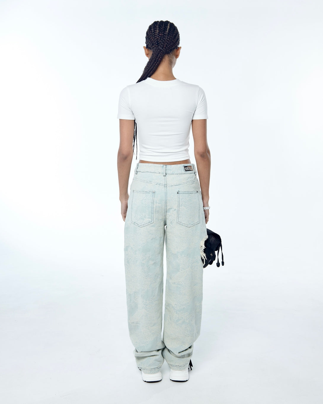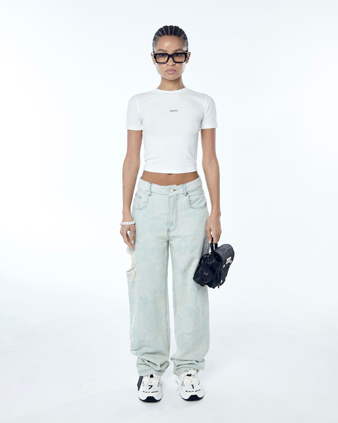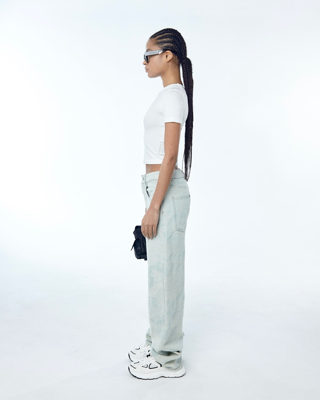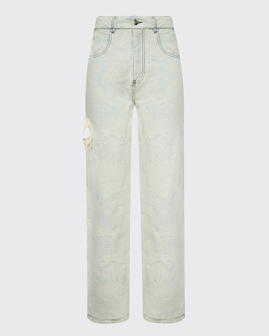 Découvrez le jean de la collection Nosce Te Ipsum, avec sa coupe droite et ample, alliant confort et style. Confectionné en denim dense, il est orné de broderies machine et d'un effet déchiré pour un effet volumineux. Il est orné de logos chenille et d'un marquage métallique à l'arrière de la ceinture. Il peut être ajusté à la hauteur souhaitée en atelier. Il est livré avec une chemise raccourcie pour un look complet.