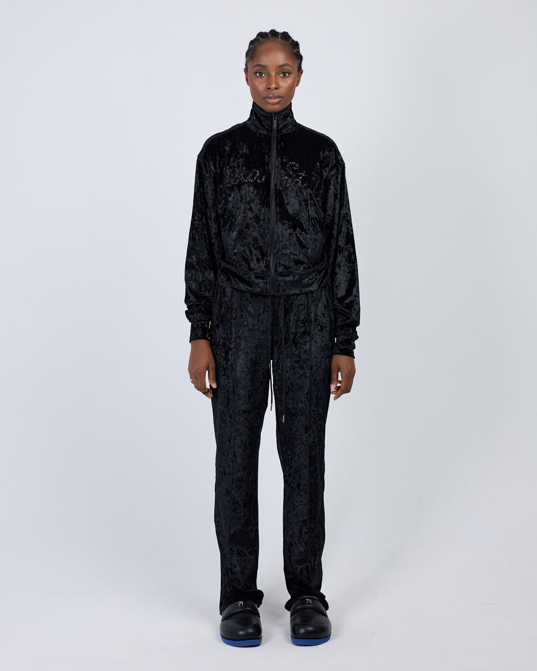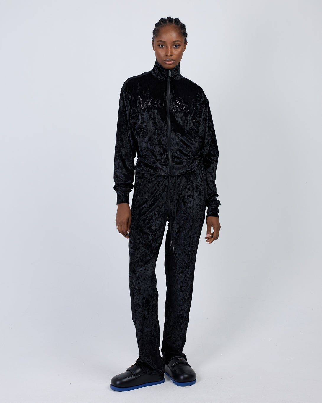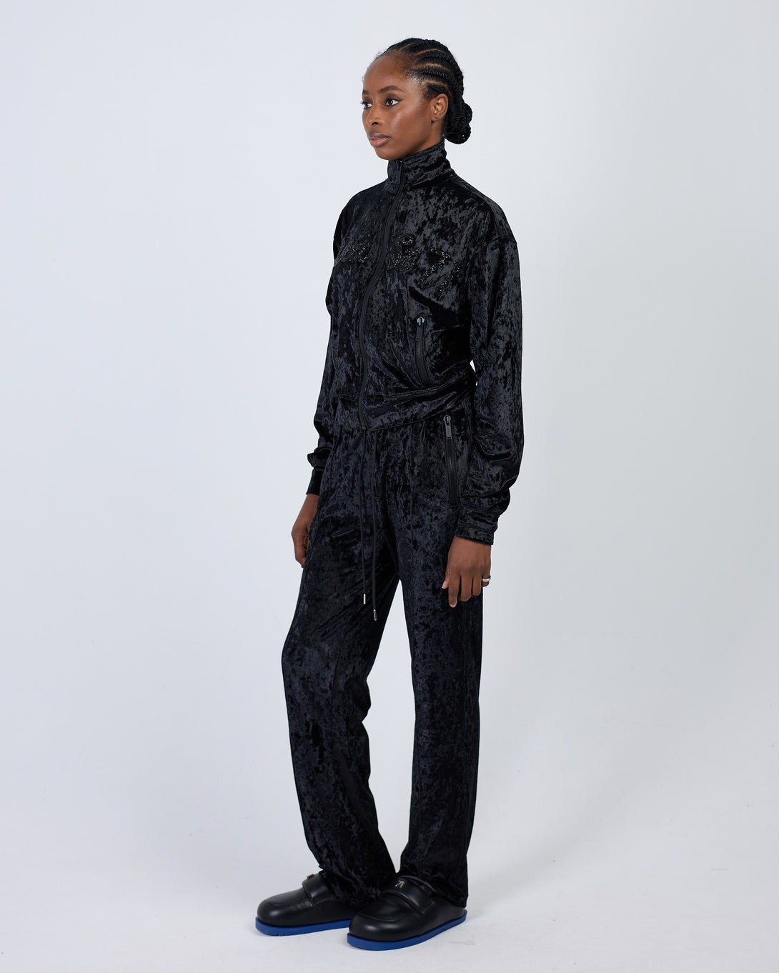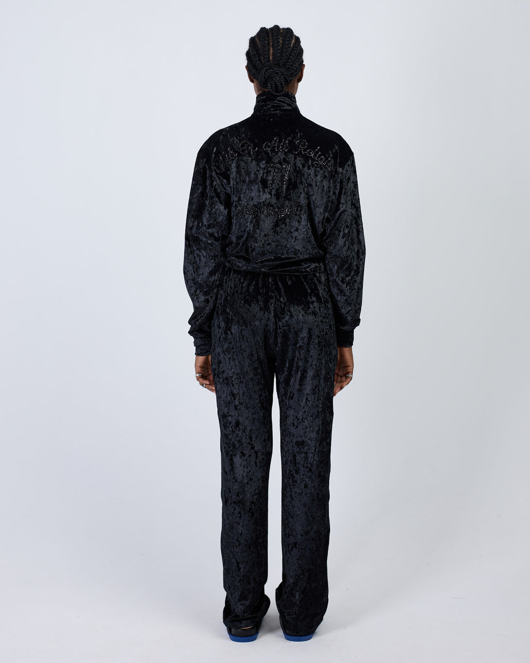 Optez pour l'élégant costume noir en velours de SUIT CLUB ASIA ST 71. Orné de strass et d'un col montant, ce costume tendance est conçu pour un confort optimal. Les fermetures éclair en acier siglées et les fermetures éclair à logo ajoutent une touche de sophistication, tandis que la taille élastique avec cordon de serrage et les poches avant offrent confort et style.