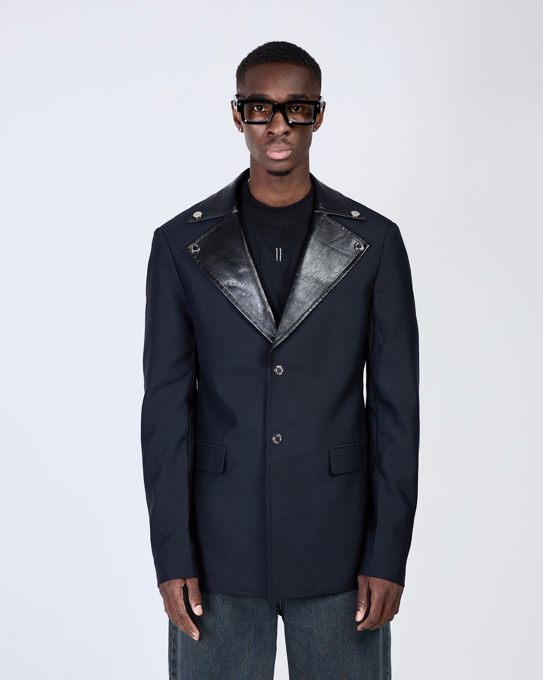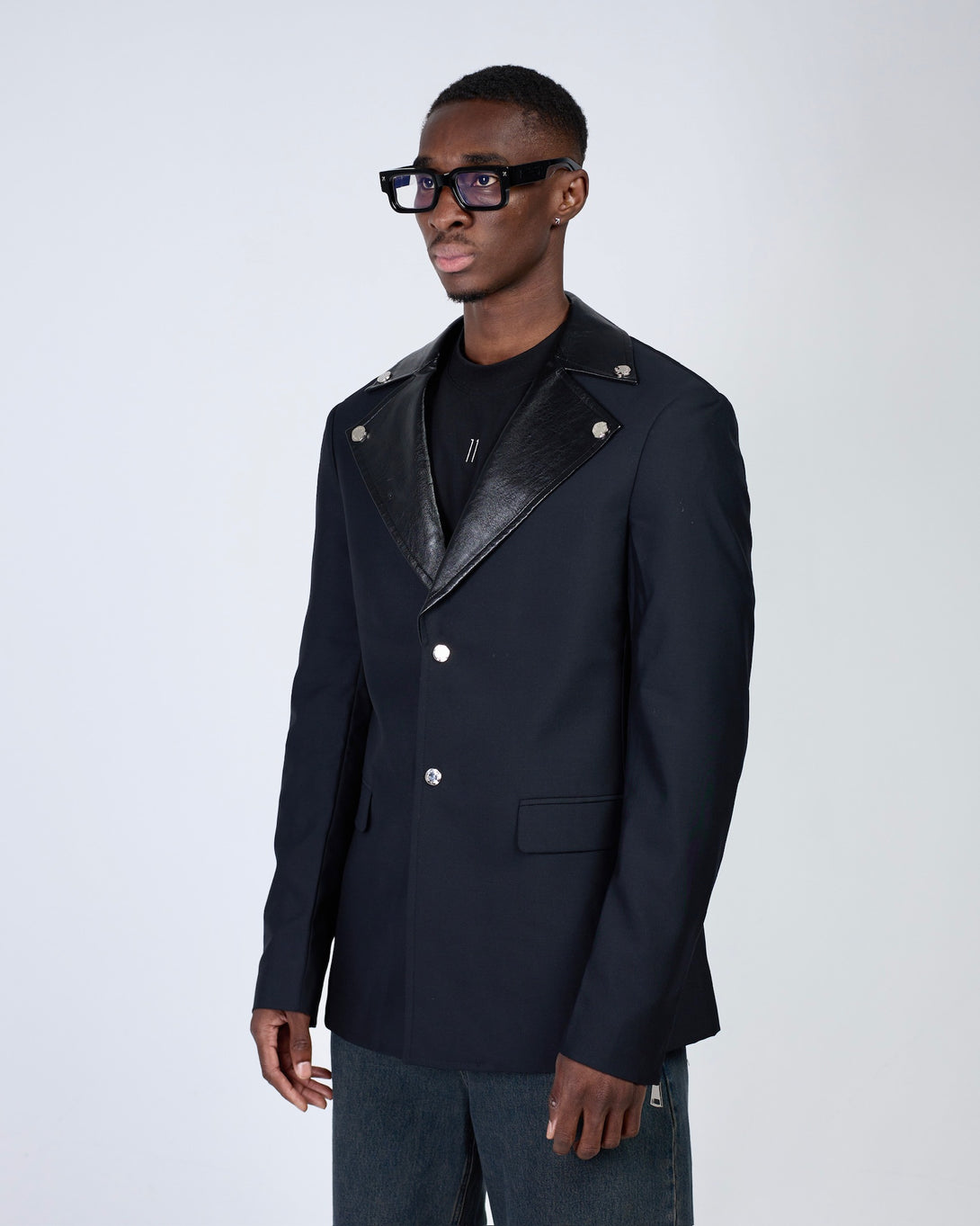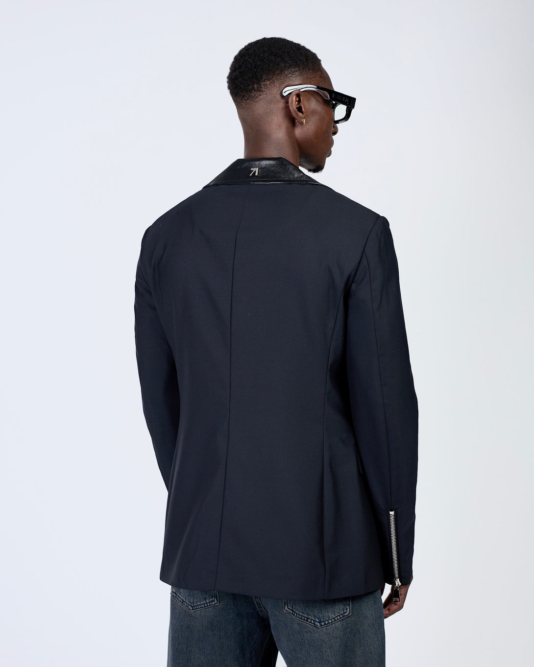 Add a touch of sophistication to your attire with our BLAZER CL71 LEATHER LAPEL BLACK. Made with durable half-wool and adorned with textured leather lapels and branded steel fittings, this jacket exudes elegance. Perfect for pairing with trousers from the CL71 collection or basic jeans, complete your look with a beret, bag-folder, and shoes.