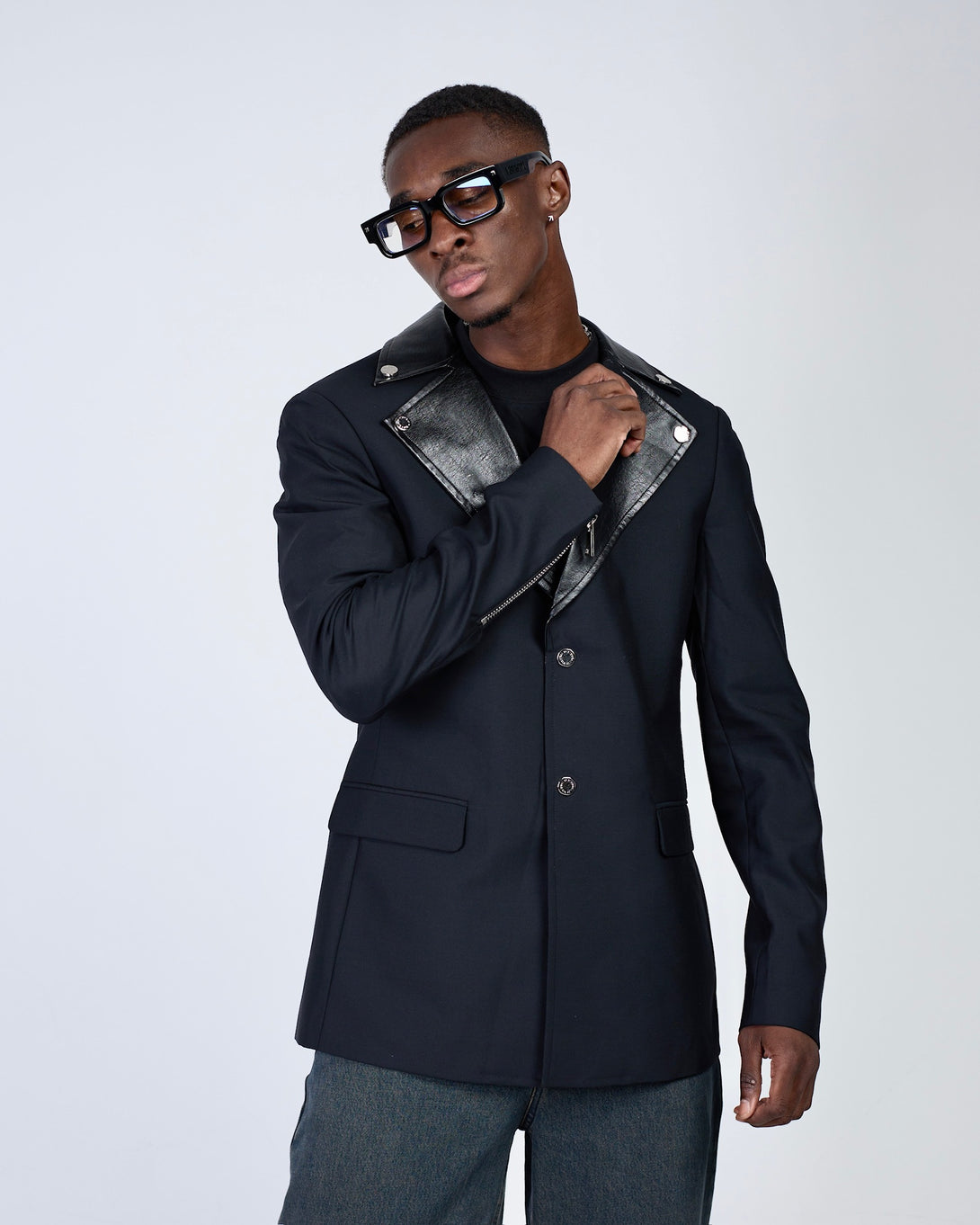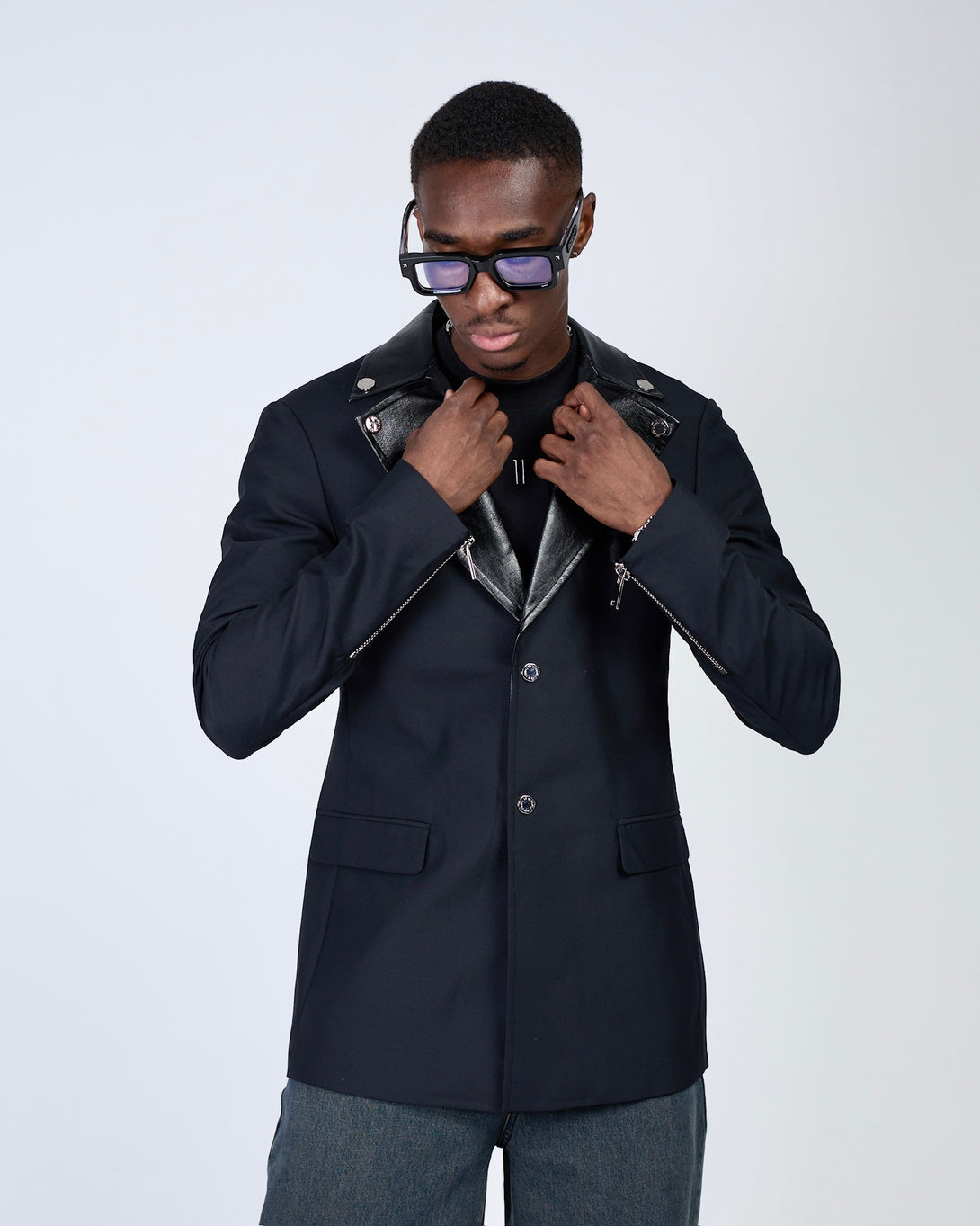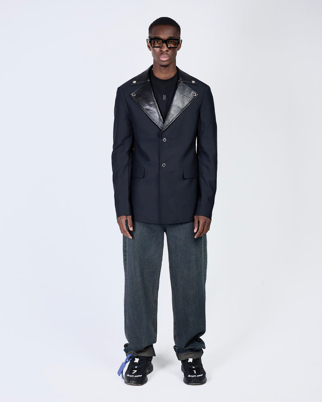 Add a touch of sophistication to your attire with our BLAZER CL71 LEATHER LAPEL BLACK. Made with durable half-wool and adorned with textured leather lapels and branded steel fittings, this jacket exudes elegance. Perfect for pairing with trousers from the CL71 collection or basic jeans, complete your look with a beret, bag-folder, and shoes.