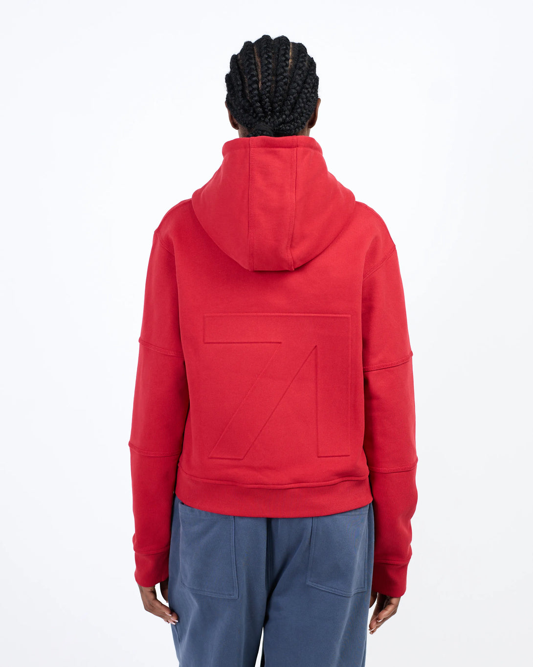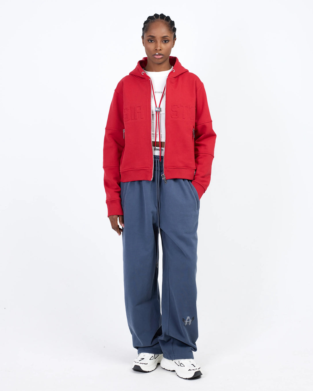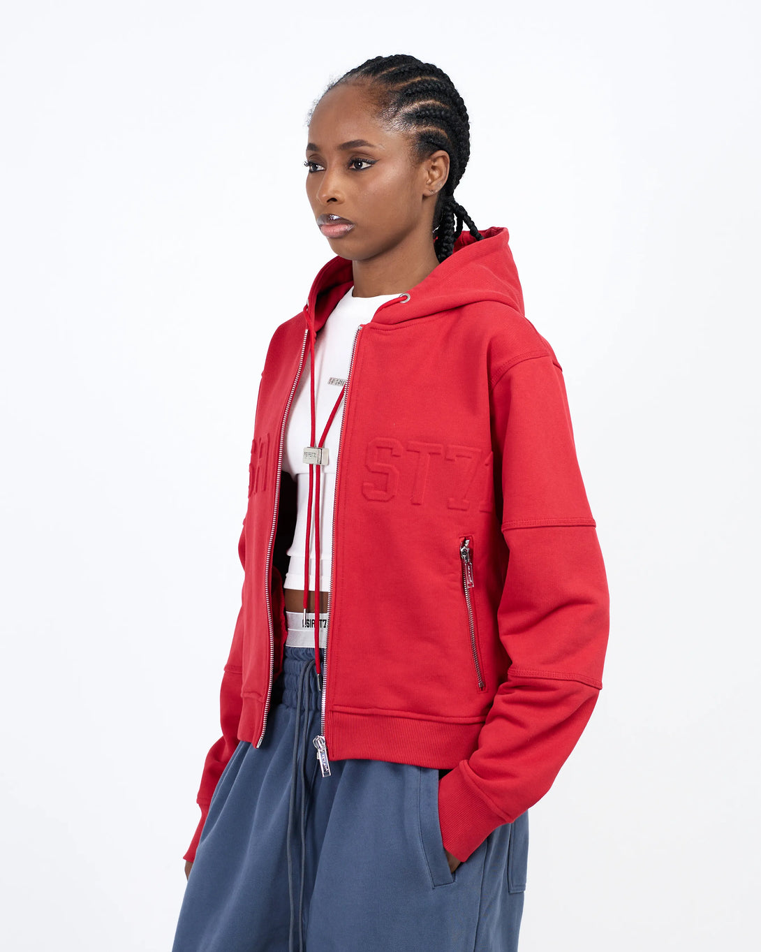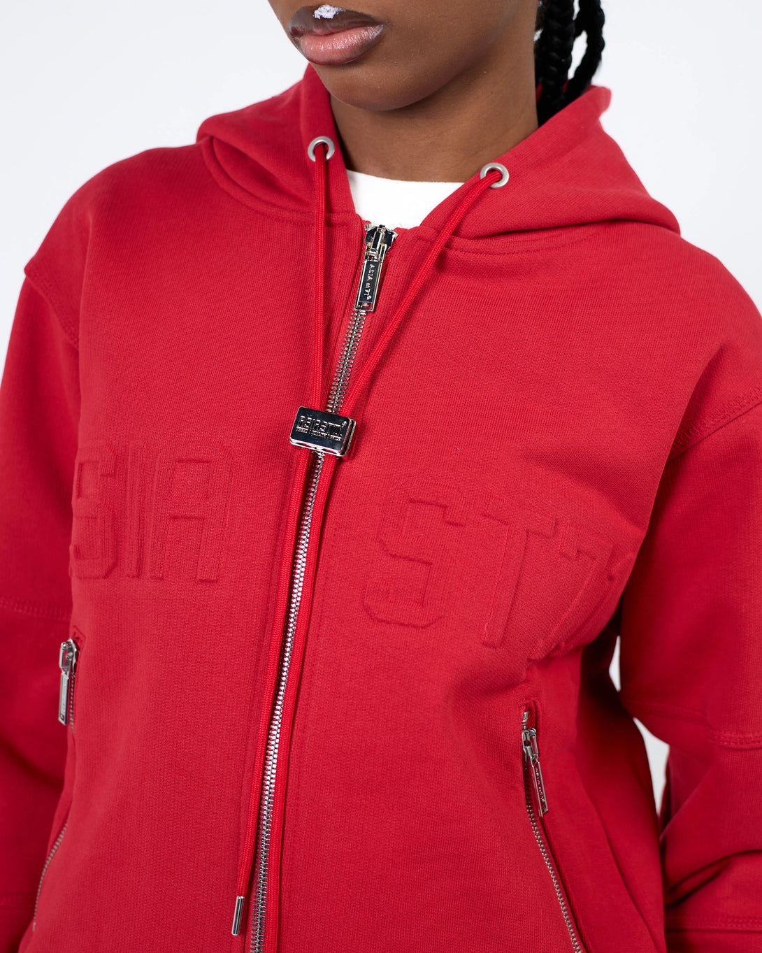 This red embossed zip hoodie is made of high-quality, dense cotton and features branded metal hardware and accent seams on the sleeves. The elastic cuffs and hem provide a comfortable fit. This essential hoodie adds a pop of color to any outfit and is compatible with various styles. The lace clip is not included with the order.
