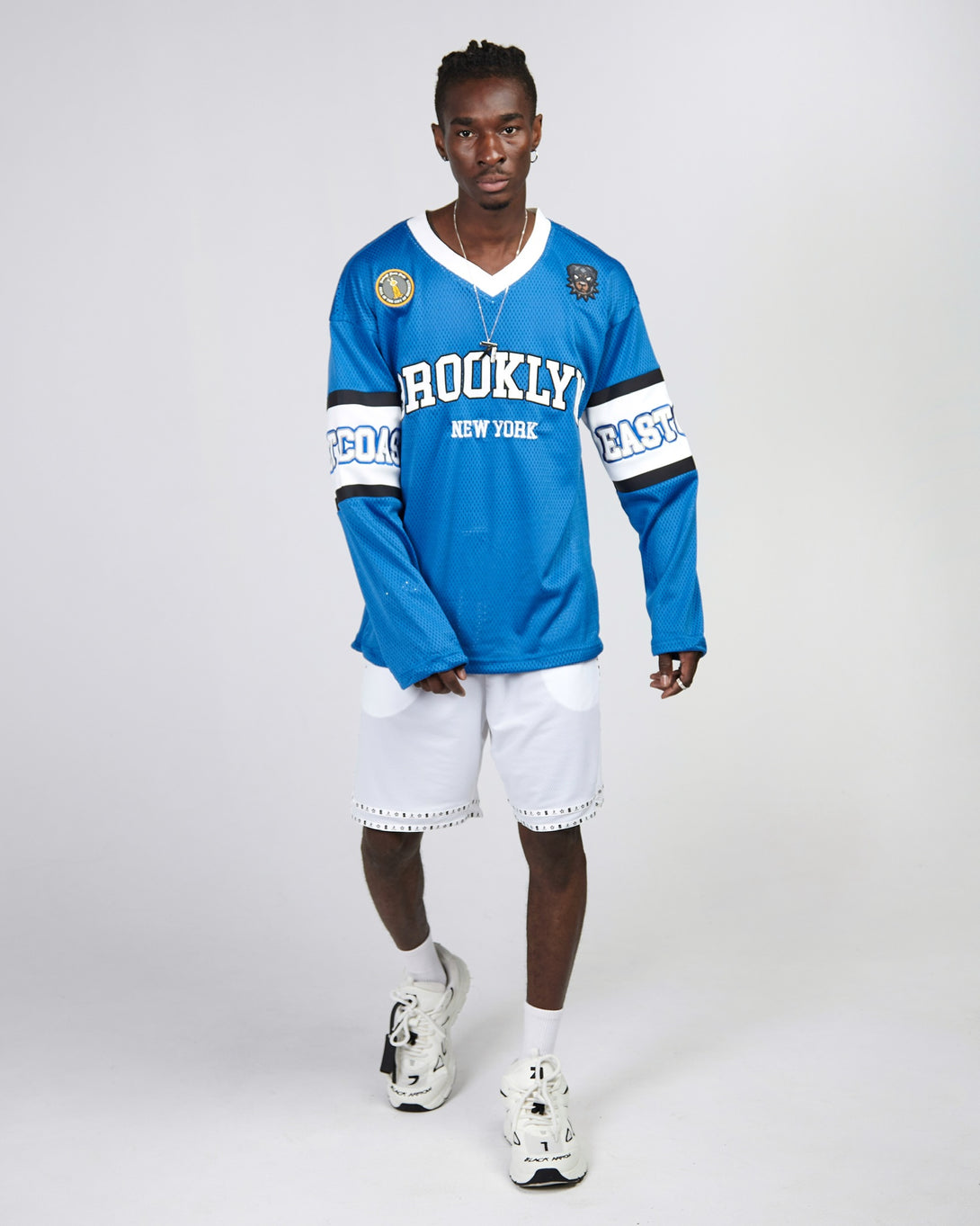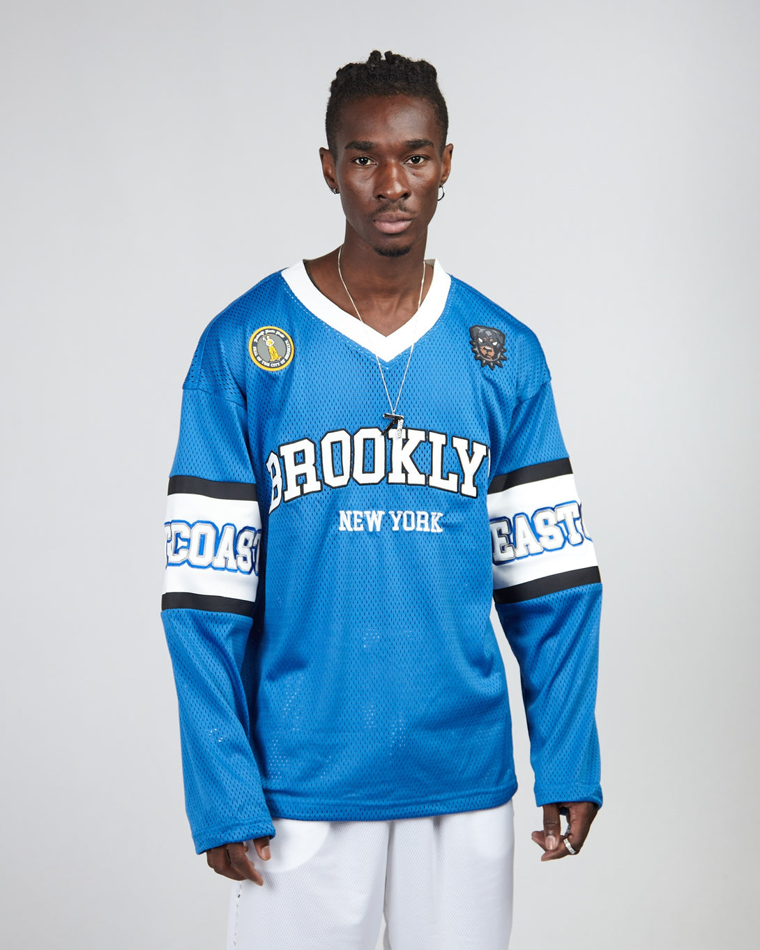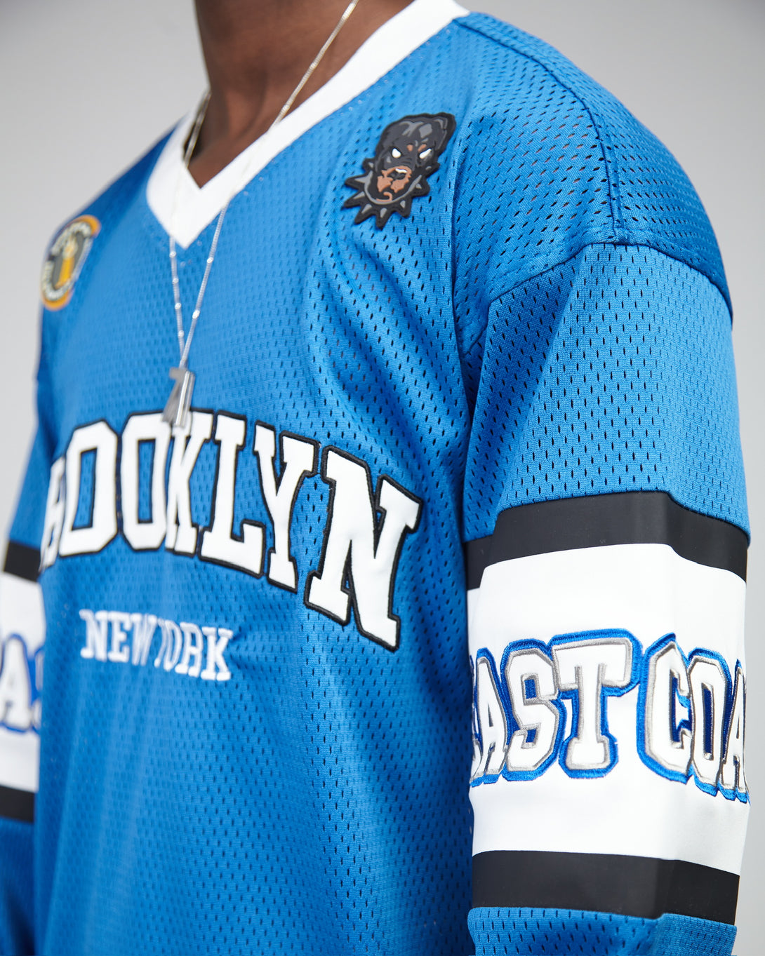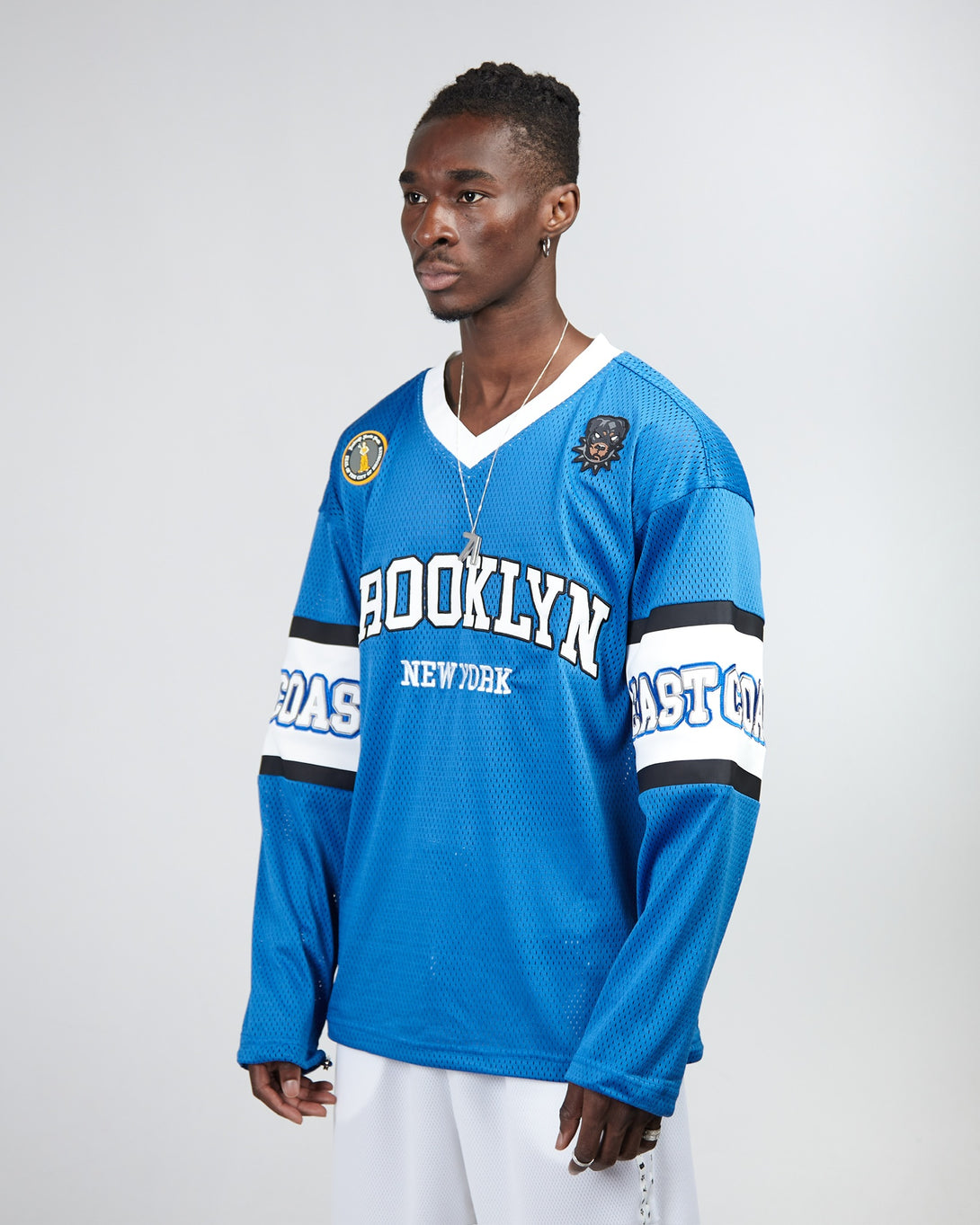 Experience style and comfort in this Brooklyn mesh long sleeve shirt. Its loose fit is perfect for sports, while the special knit fabric ensures breathability. Embroidered logos and rubber patches add a unique touch. Expertly designed for the ultimate sporting experience.
