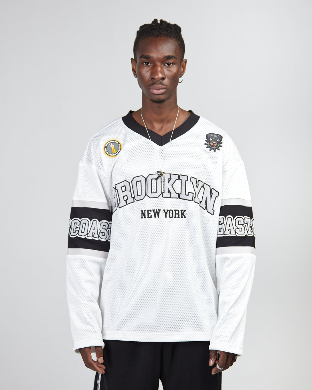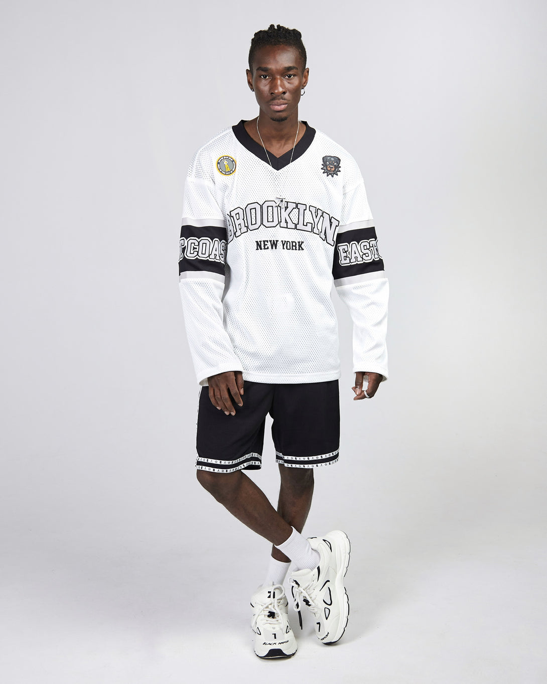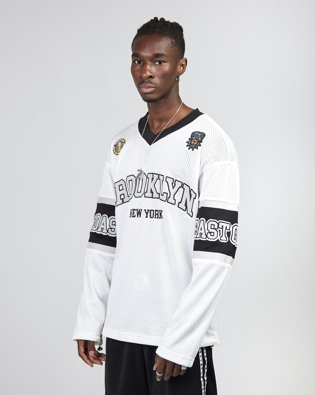 Upgrade your sportswear with our LONGSLEEVE BROOKLYN MESH WHITE. Made with a unique porous fabric, this loose-cut long sleeve shirt from our Brooklyn collection features embroidered logos, patches, and rubberized appliques for a professional touch. Elevate your athletic look and performance today.