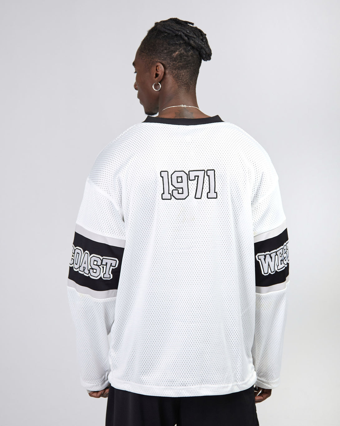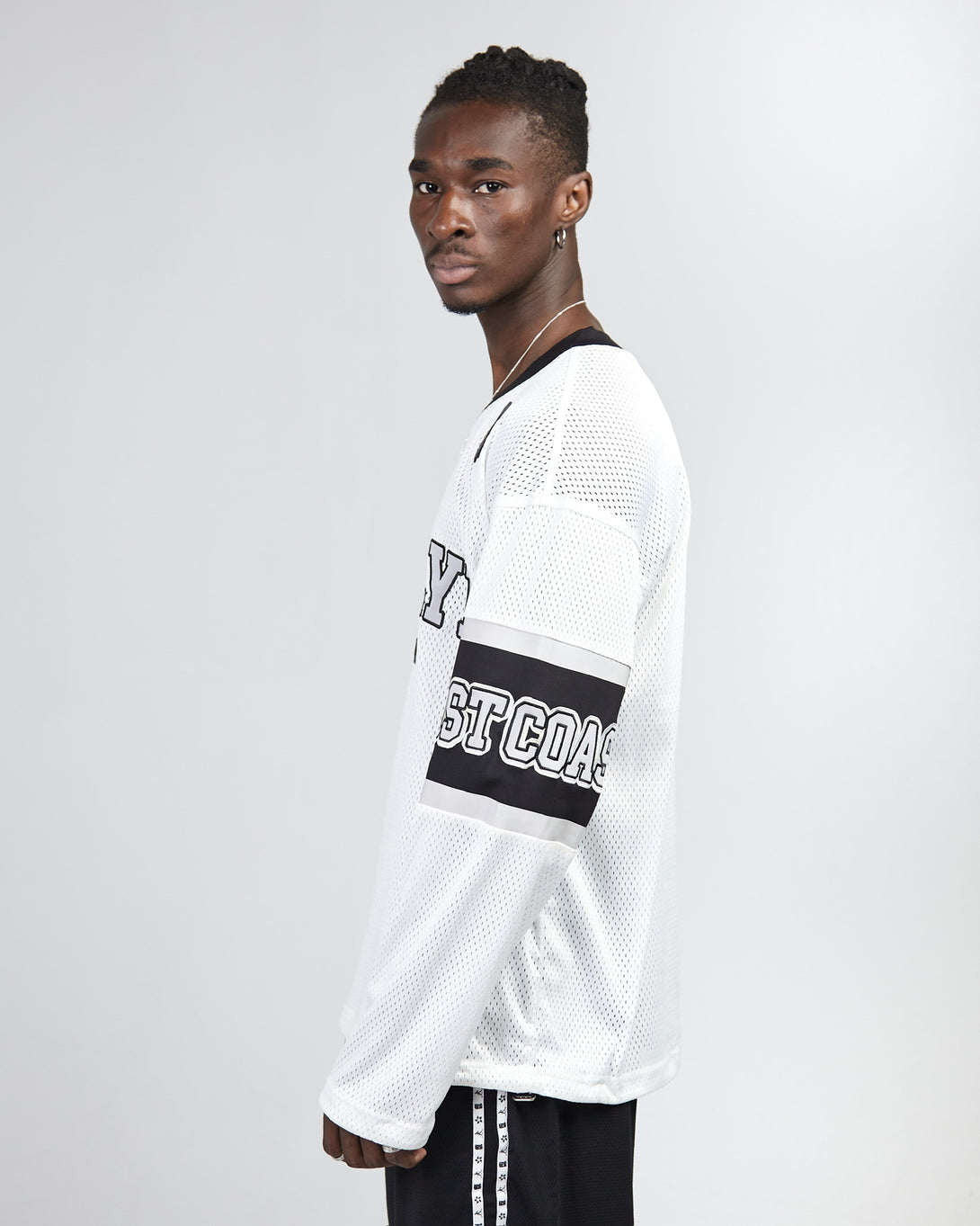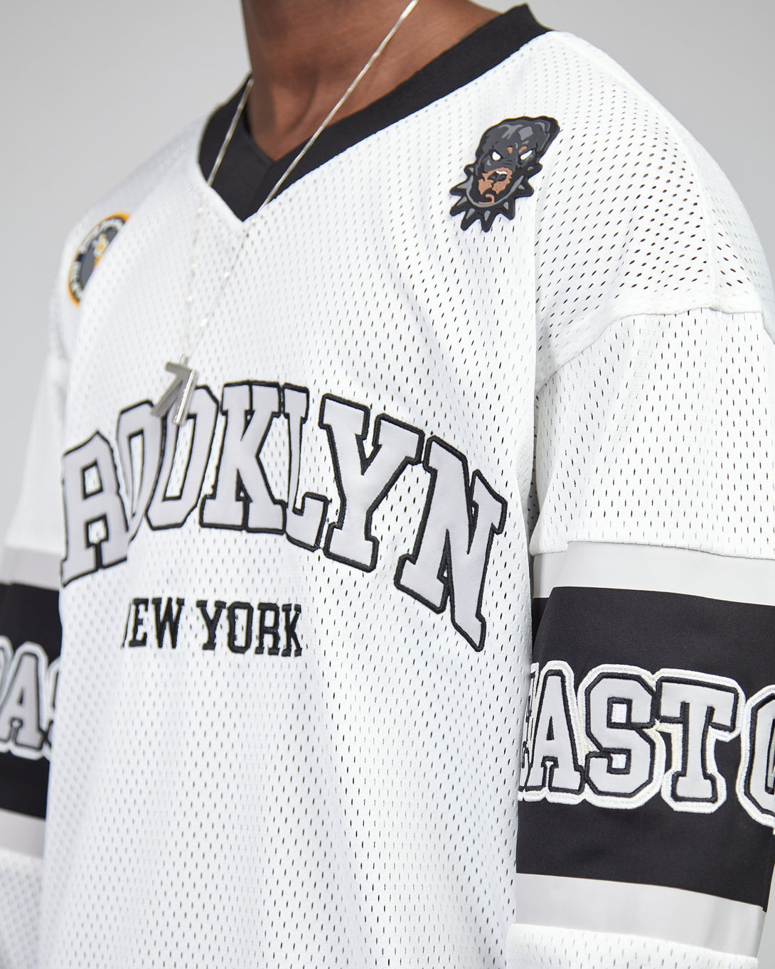 Upgrade your sportswear with our LONGSLEEVE BROOKLYN MESH WHITE. Made with a unique porous fabric, this loose-cut long sleeve shirt from our Brooklyn collection features embroidered logos, patches, and rubberized appliques for a professional touch. Elevate your athletic look and performance today.