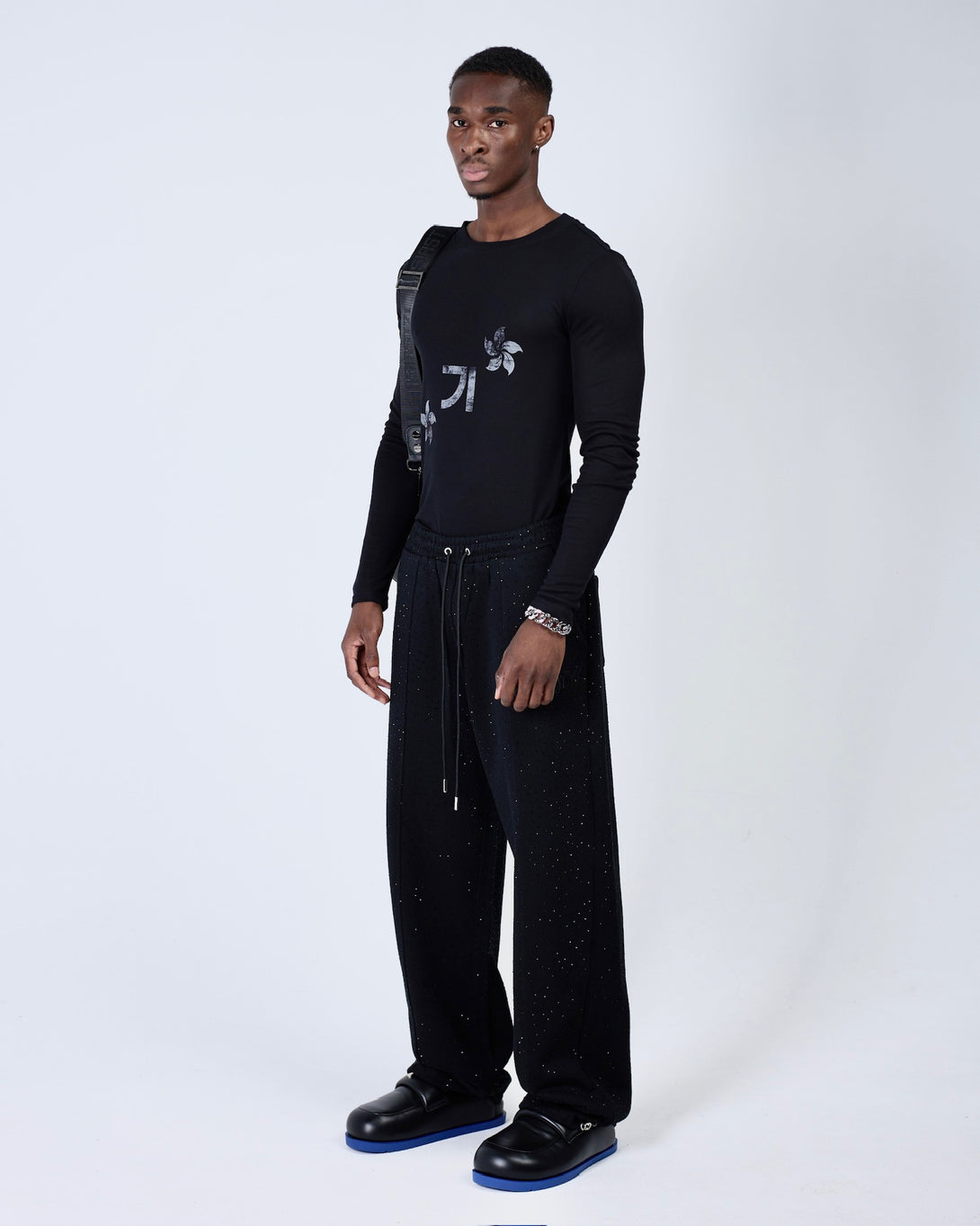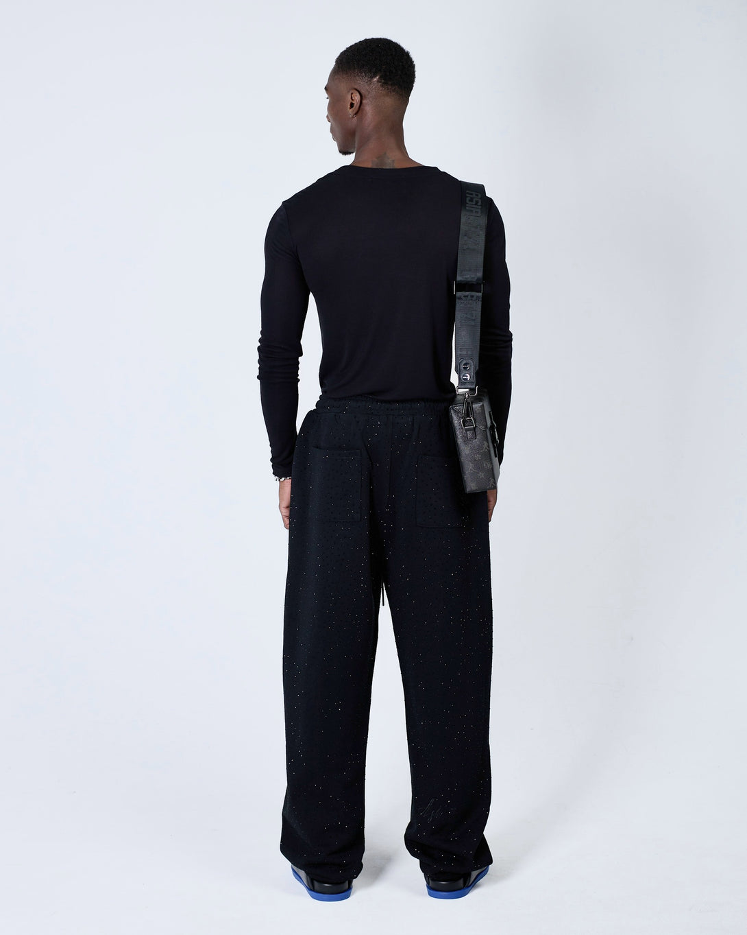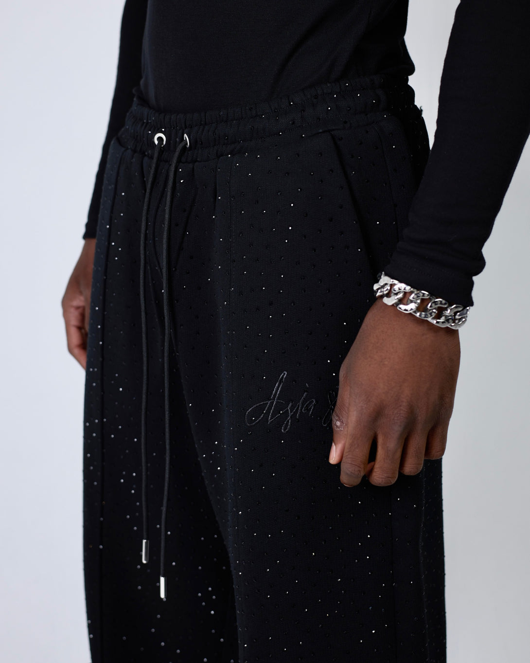 These straight-fit pants are constructed from sturdy cotton and embellished with rhinestones throughout. The comfortable elastic waistband features a drawstring and metal aglets. Perfect for creating sporty-chic looks and adding a standout piece to your wardrobe.