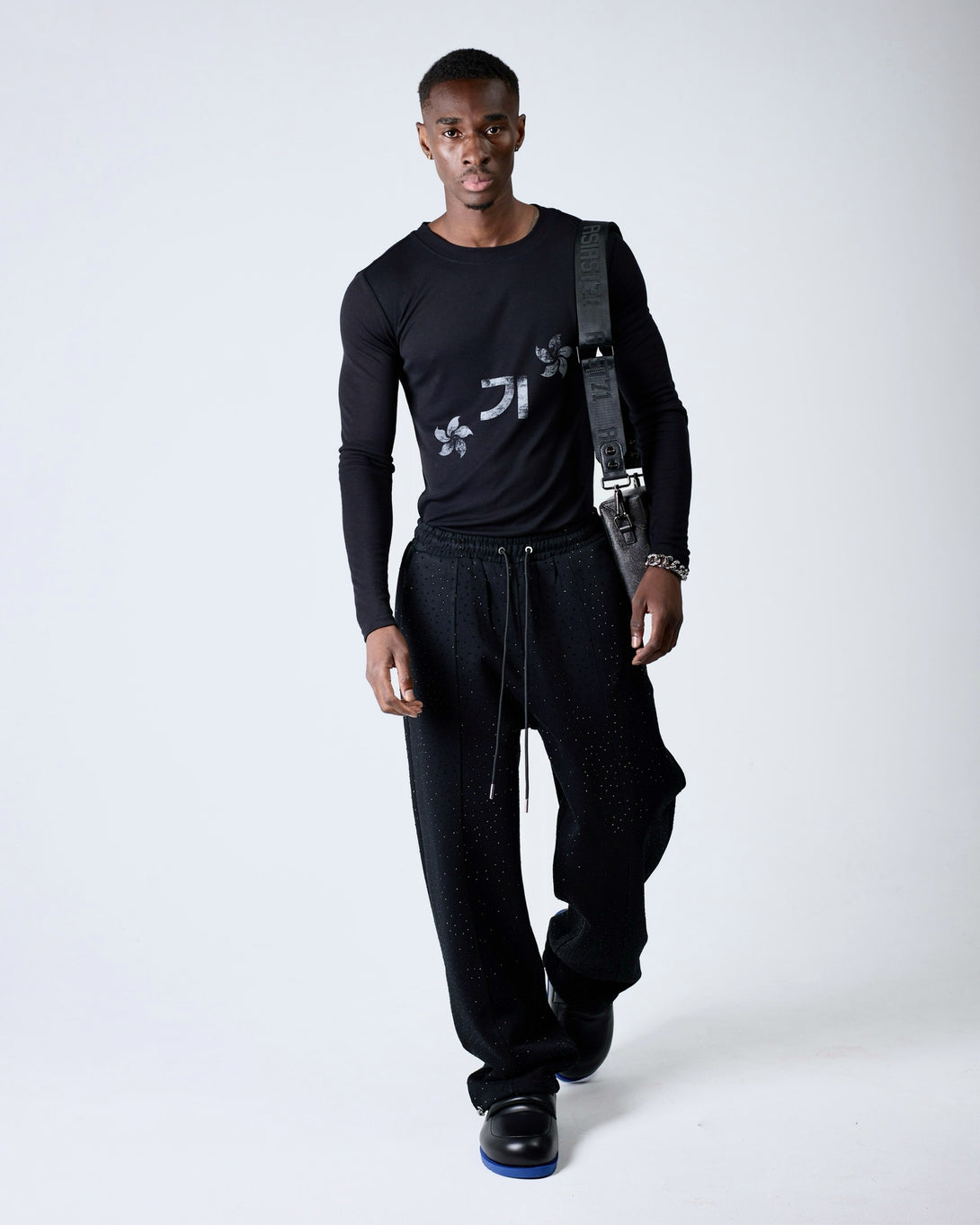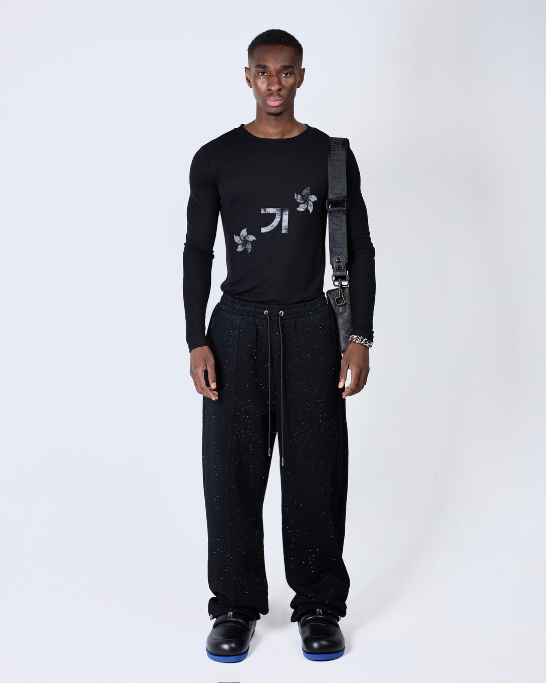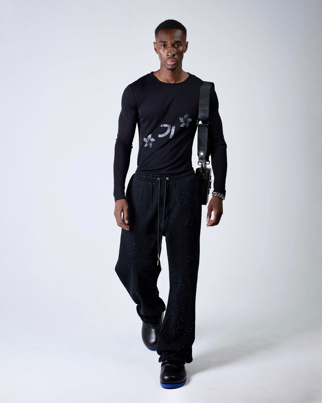 These straight-fit pants are constructed from sturdy cotton and embellished with rhinestones throughout. The comfortable elastic waistband features a drawstring and metal aglets. Perfect for creating sporty-chic looks and adding a standout piece to your wardrobe.
