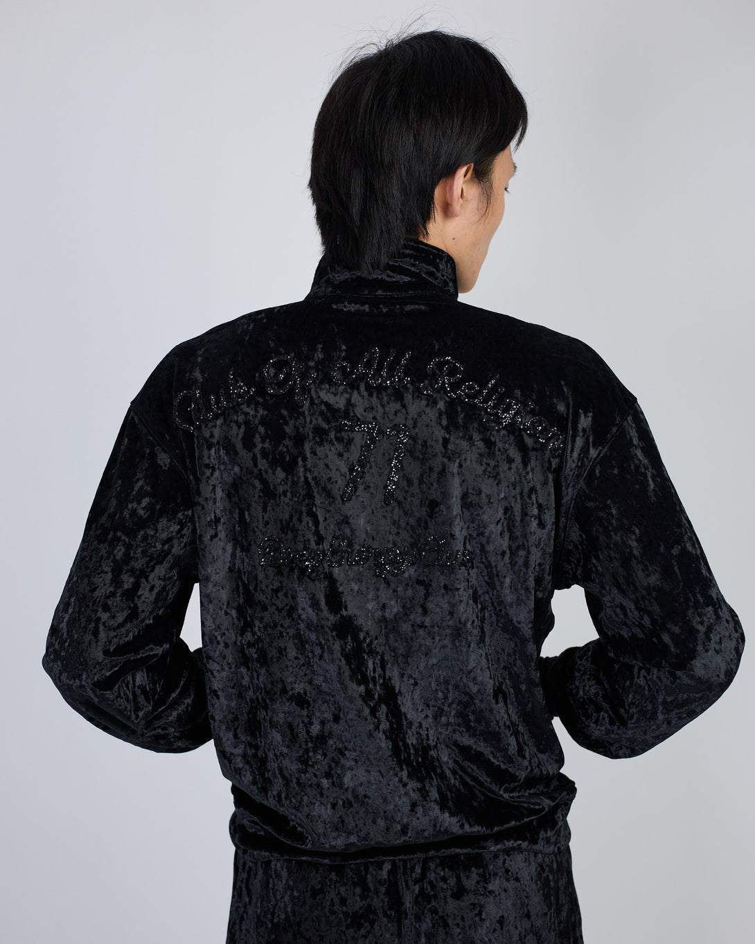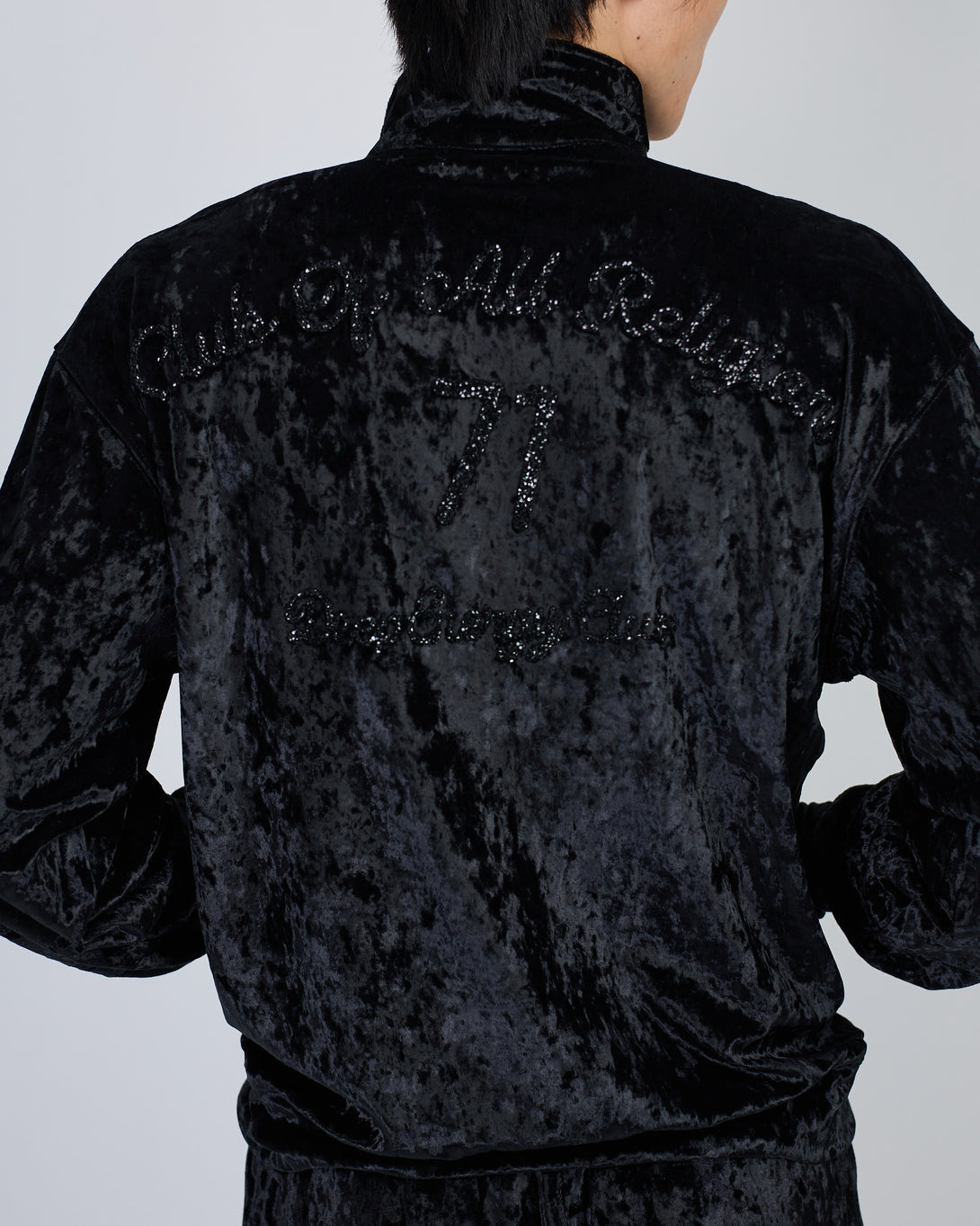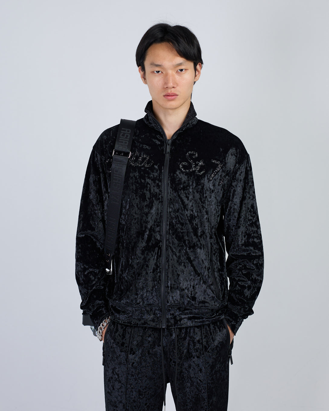 Get the stylish Velour Black suit from SUIT CLUB ASIA ST 71. Featuring rhinestone details and a high collar, this trendy suit is designed for a comfortable fit. The branded steel zippers and logo zippers add a touch of sophistication, while the elastic waistband with drawstring and front pockets provide convenience and style.