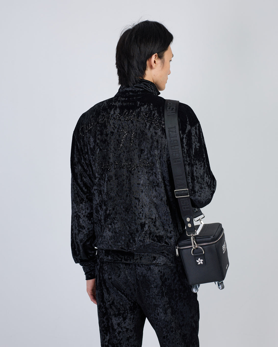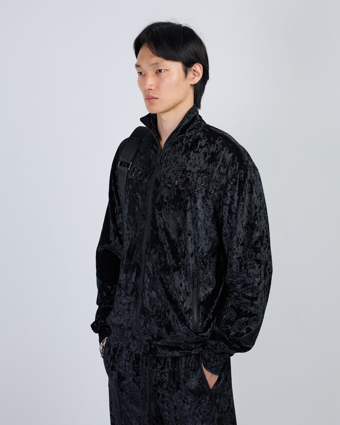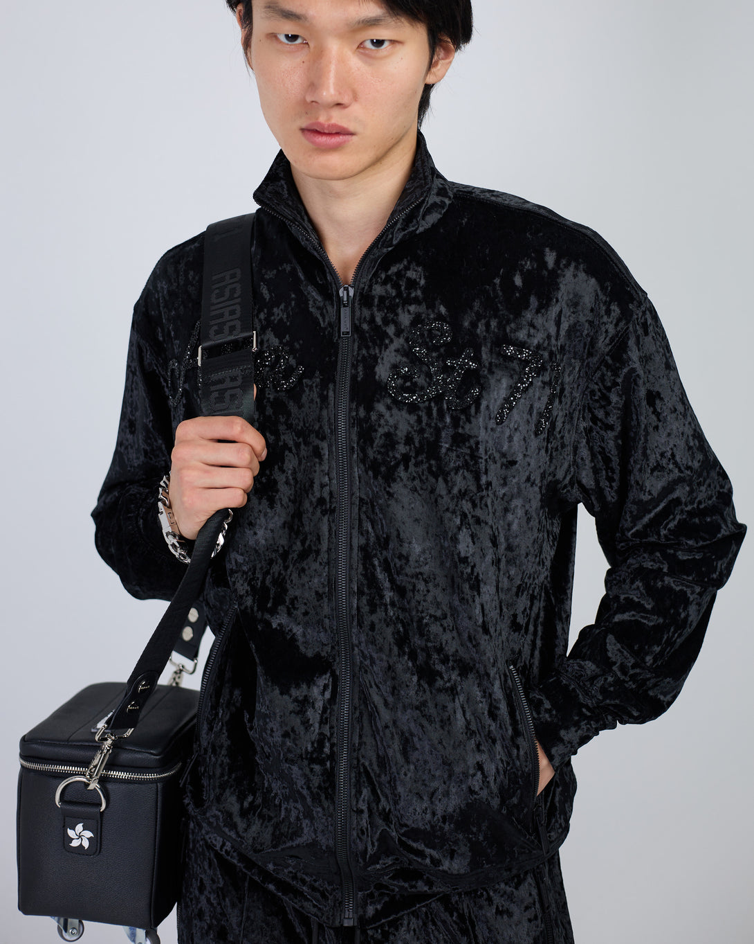 Get the stylish Velour Black suit from SUIT CLUB ASIA ST 71. Featuring rhinestone details and a high collar, this trendy suit is designed for a comfortable fit. The branded steel zippers and logo zippers add a touch of sophistication, while the elastic waistband with drawstring and front pockets provide convenience and style.